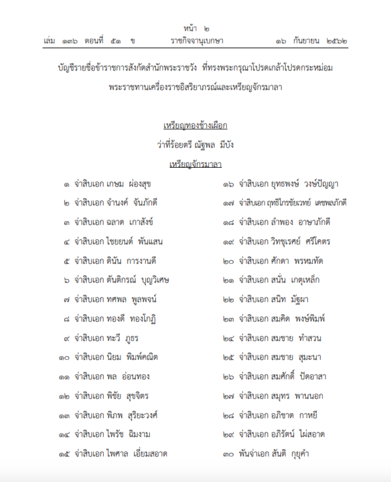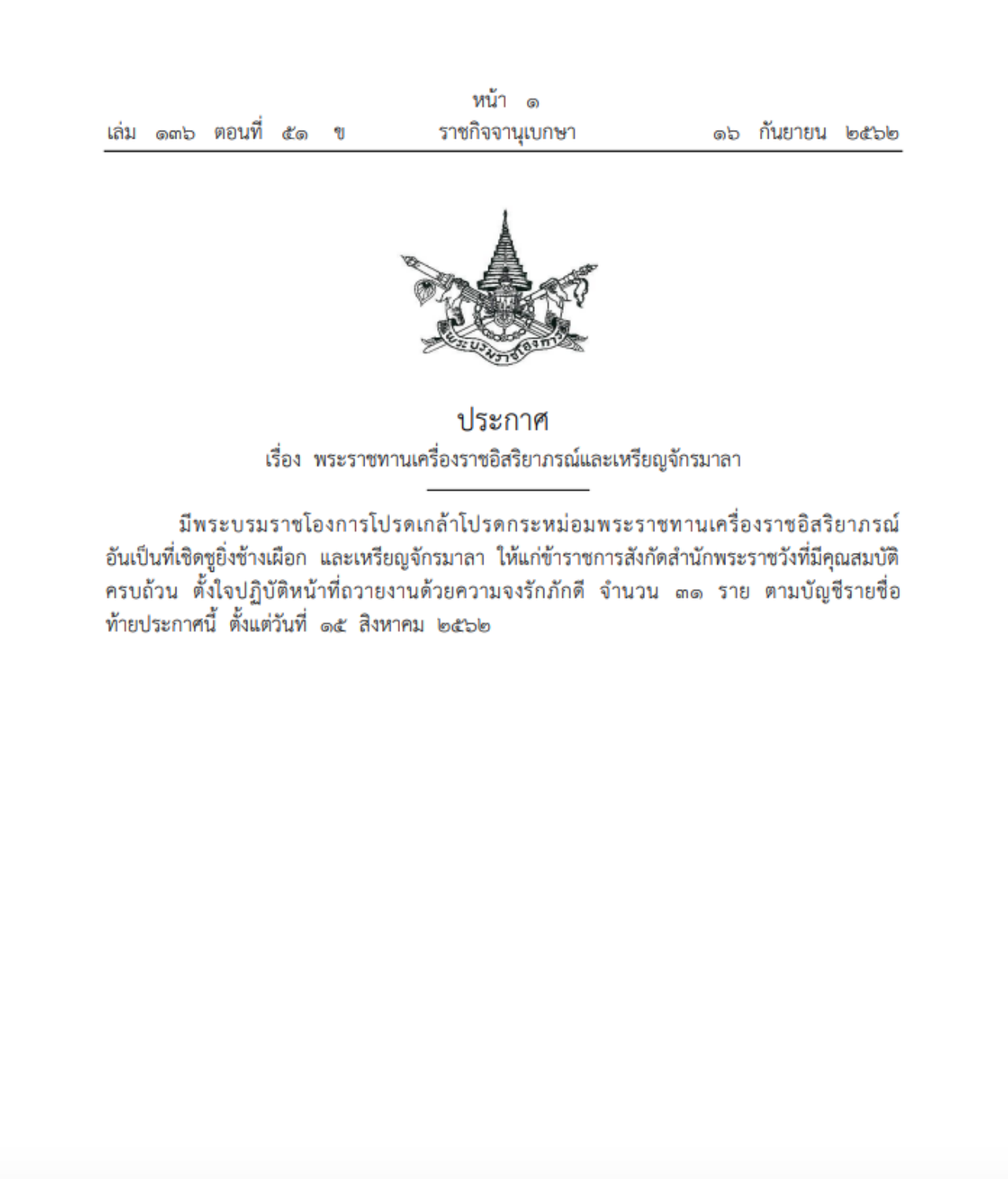 เว็บไซต์ราชกิจจานุเบกษา เผยแพร่ประกาศ เรื่อง พระราชทานเครื่องราชอิสริยาภรณ์และเหรียญจักรมาลา โดยระบุว่า มีพระบรมราชโองการโปรดเกล้าโปรดกระหม่อม พระราชทานเครื่องราชอิสริยาภรณ์ อันเป็นที่เชิดชูยิ่งช้างเผือก และเหรียญจักรมาลา ให้แก่ข้าราชการสังกัดสำนักพระราชวัง ที่มีคุณสมบัติครบถ้วน ตั้งใจปฏิบัติหน้าที่ถวายงานด้วยความจงรักภักดี จำนวน 31 ราย ตามบัญชีรายชื่อ ท้ายประกาศนี้ ตั้งแต่วันที่ 15 สิงหาคม 2562