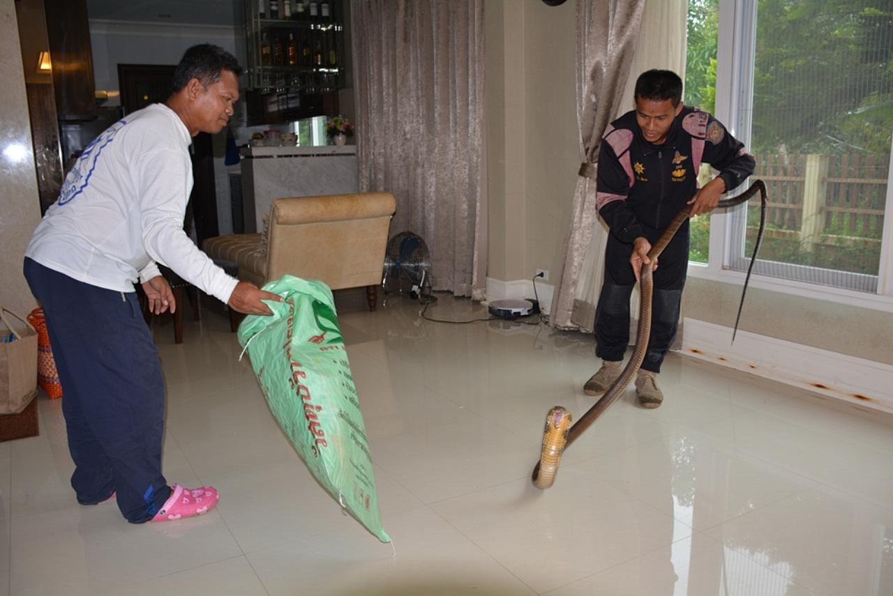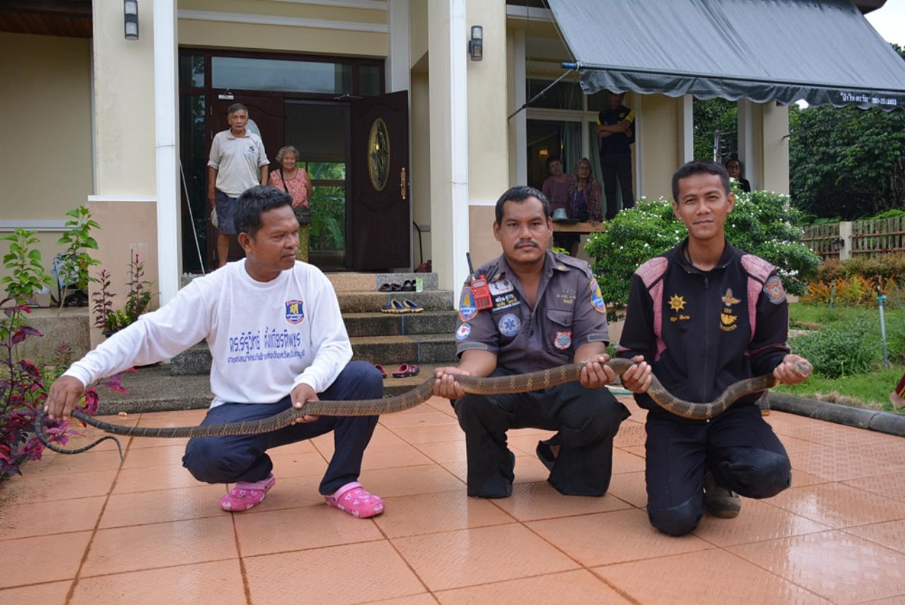 ทั้งนี้ ด้วยความตื่นตกใจได้ร้องตะโกนให้คนช่วย แต่ไม่มีใครได้ยิน จึงตัดสินใจเสี่ยงตายกระโดดกลับไปที่โต๊ะกระจก หน้าโซฟา และคว้าโทรศัพท์รีบโทรแจ้งเจ้าหน้าที่กู้ภัยฯ มาช่วยจับงูดังกล่าว