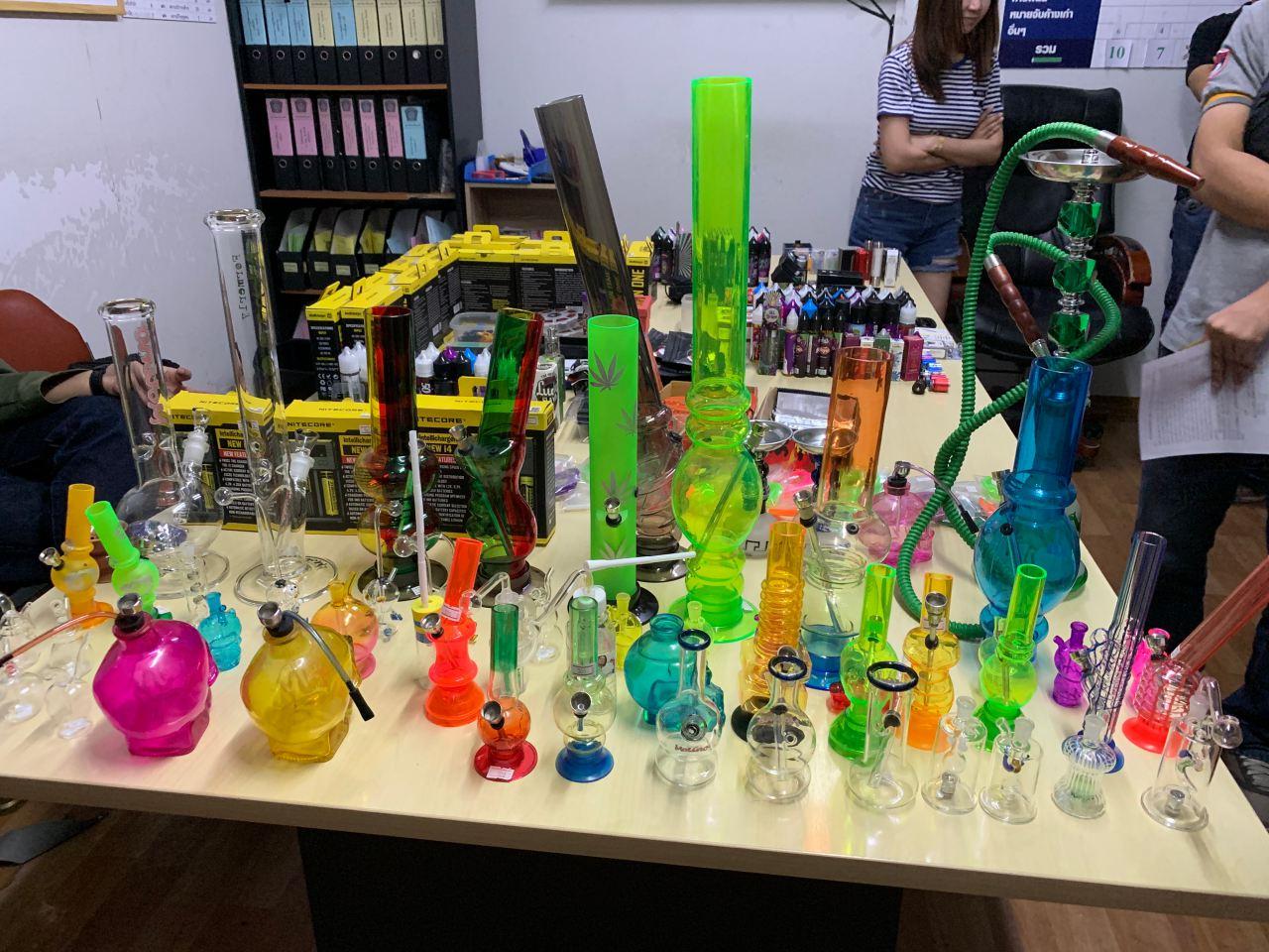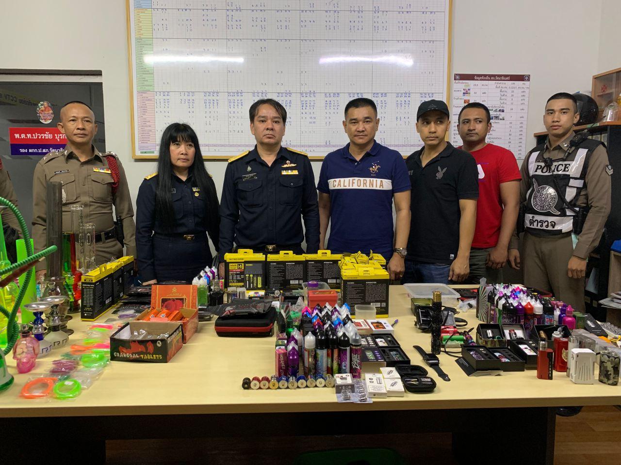 โดยร้านแรกได้ ของกลางน้ำยาบุหรี่ไฟฟ้า 60 หลอด ตัวบุหรี่ไฟฟ้า 12 ตัว อุปกรณ์ 41 ชิ้น ร้านที่ 2 เตาบารากู่ 58 ตัว สายยางเตาบารากู่ 30 ชิ้น ถ่านบารากู่ 13 ชิ้น ร้านที่ 3 น้ำยาบุหรี่ไฟฟ้า 71 หลอด ตัวบุหรี่ไฟฟ้า 3 ตัว อุปกรณ์ 38 ชิ้น และร้านที่ 4 น้ำยาบุหรี่ไฟฟ้า 32 หลอด ตัวบุหรี่ไฟฟ้า 46 ตัว อุปกรณ์ 58 ชิ้น
