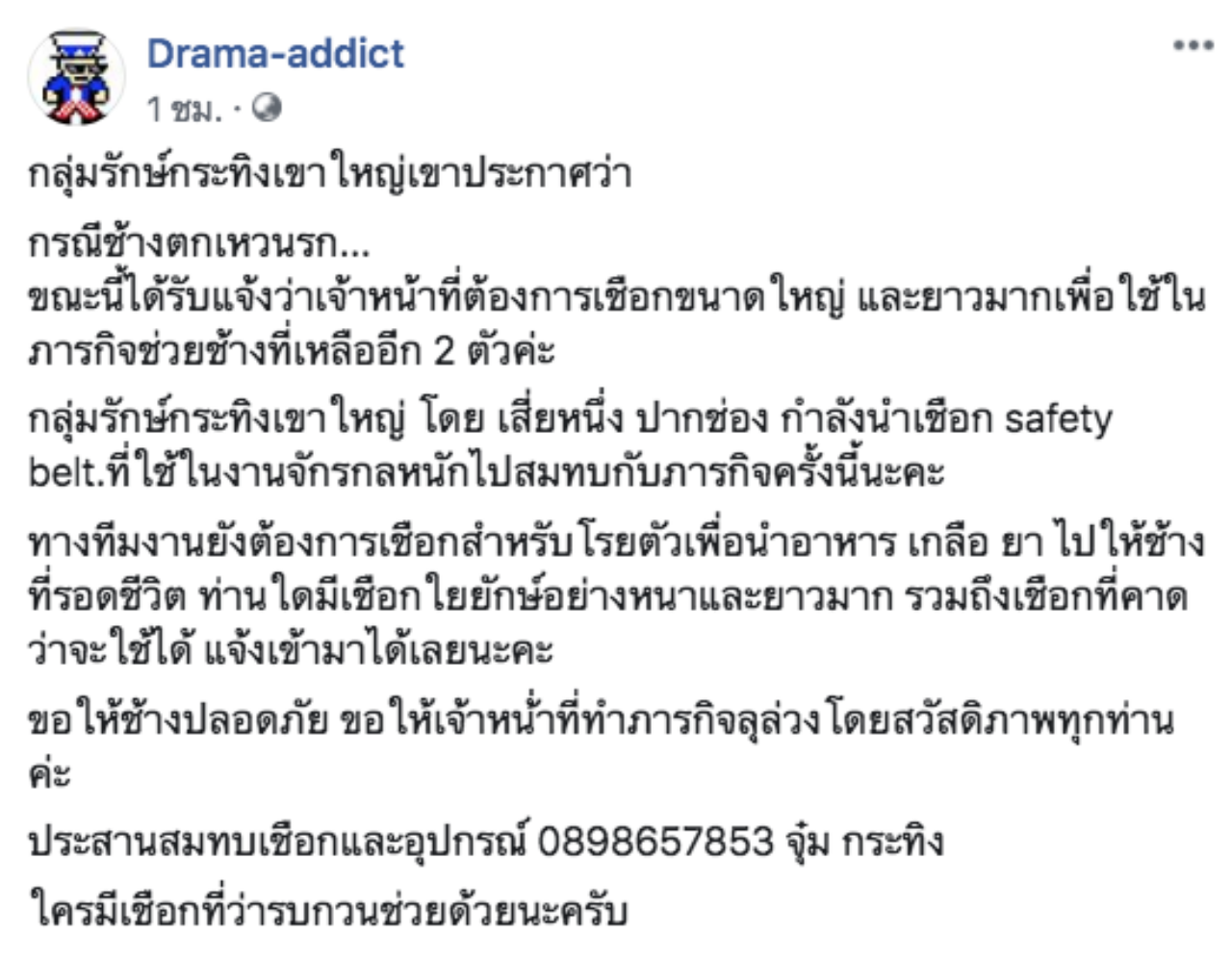 ทั้งนี้ กลุ่มรักษ์กระทิงเขาใหญ่ กำลังนำเชือก safety belt ที่ใช้ในงานจักรกลหนักไปสมทบกับภารกิจ แต่ทางทีมงาน ยังต้องการเชือกสำหรับโรยตัวเพื่อนำอาหาร เกลือ ยา ไปให้ช้างที่รอดชีวิต หากใครมีเชือก ที่คาดว่าจะใช้ได้ สามารถติดต่อได้ที่ 0898657853 จุ๋ม กระทิง