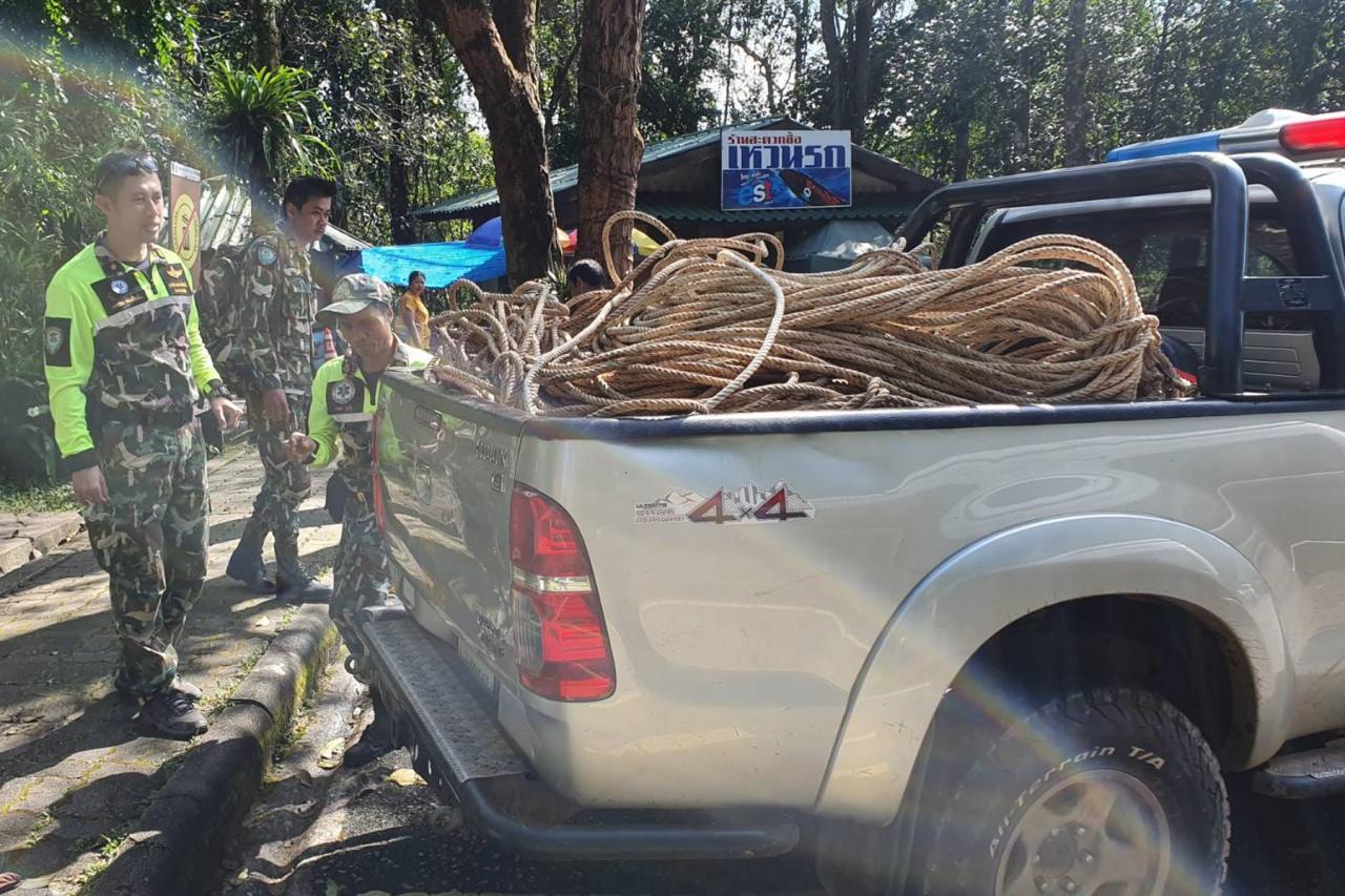 เจ้าหน้าที่เตรียมภารกิจ กู้ซากช้างตกเหว 6 ตัว พร้อมนำเชือกทำตาข่ายรอดักซากช้าง เพื่อไม่ให้ซากช้างไหลลงสู่เขื่อนขุนด่านปราการชล