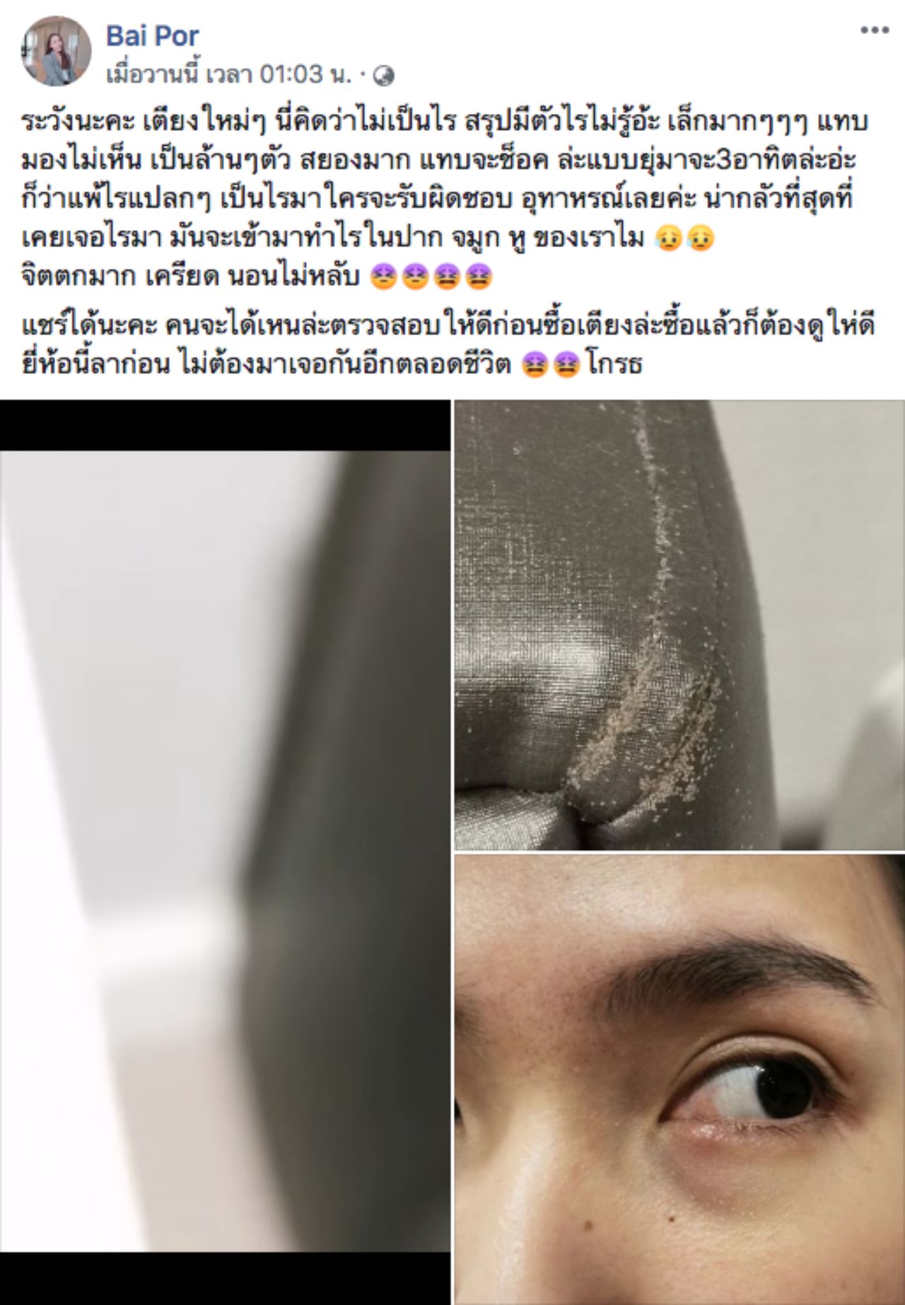 ผู้ใช้เฟซบุ๊ก "Bai Por" ได้โพสต์คลิปฝูงแมลงตัวน้อยนับล้านตัวเดินยั้วเยี้ยที่ขอบเตียง ที่เพิ่งซื้อใหม่มาได้ประมาณ 1 เดือนเท่านั้น พร้อมข้อความว่า นอนแบบนี้มาจะ 3 อาทิตย์แล้ว ก็ว่าแพ้อะไร ตอนนี้จิตตกมาก เครียด นอนไม่หลับ กลัวว่าแมลงเหล่านี้จะเข้าปาก จมูก หู