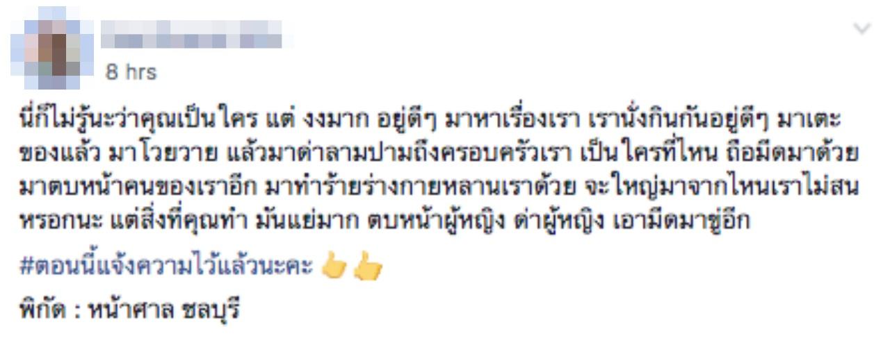 ต่อมาพบว่ามีชายใส่เสื้อสีส้ม เปิดประตูลงมาแล้วหาเรื่อง ด่าทอแบบเสียหาย ซึ่งตนก็ไม่ได้โต้ตอบอะไร แต่กลับโดนตบที่ใบหน้าและหน้าผาก จำนวน 2 ครั้ง จนใบหน้าบวมแดง และหัวบวมบูด จากนั้นได้เดินไปเตะหลานของแฟน ซึ่งเป็นสาวทอมเช่นกัน โดยที่ชายคนดังกล่าวในมือถือมีดสั้นข่มขู่ตนอีกด้วย ส่วนตัวอยากจะถามว่าอยู่ดีๆ มาตบทำไม และจะเอามีดแทง รู้จักกันหรอ ซึ่งก็ได้มีการแจ้งความไว้ที่ สภ.เมืองชลบุรี โดยยืนยันจะเอาเรื่องให้ถึงที่สุด