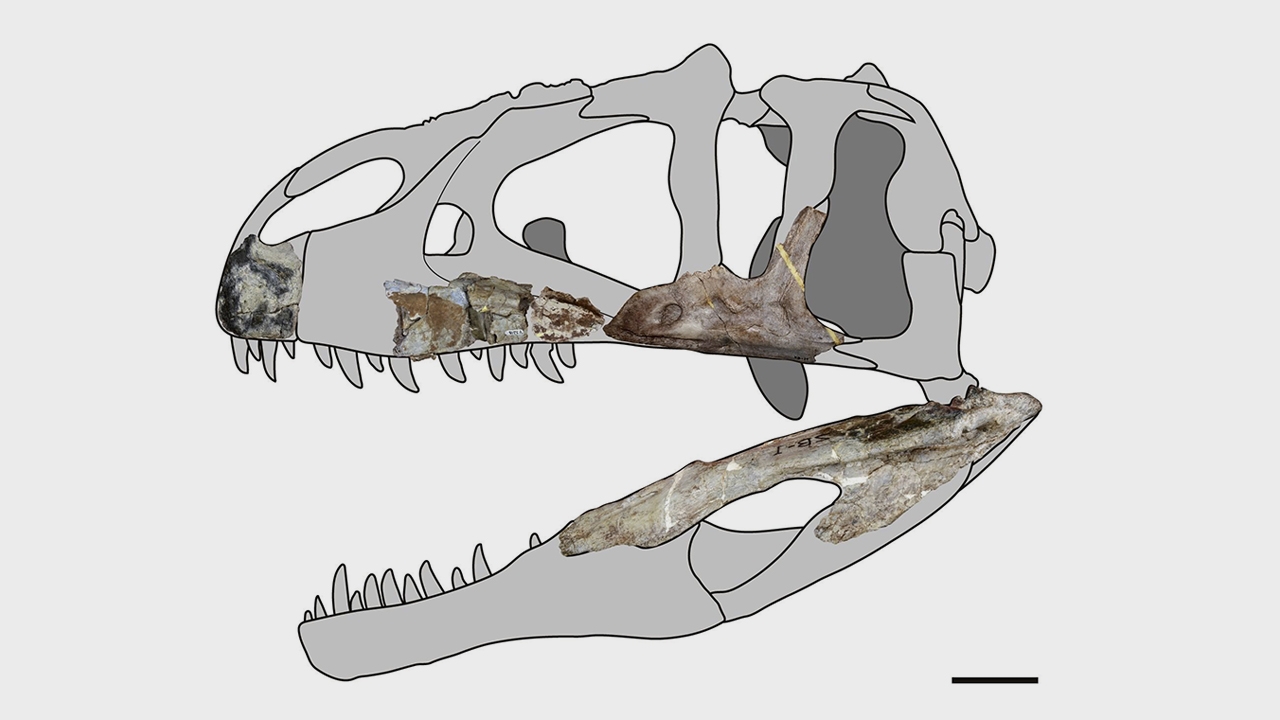 การสร้างกะโหลกศีรษะของไดโนเสาร์กินเนื้อขนาดใหญ่ที่ชื่อ Siamraptor suwati จากซากดึกดำบรรพ์หรือฟอสซิล (fossil) ที่ค้นพบในไทย โดยองค์ประกอบต่างๆ ถูกปรับให้เหมาะสมกับซากฟอสซิลต้นแบบ แสดงให้เห็นถึงส่วนหลังของขากรรไกรล่าง.