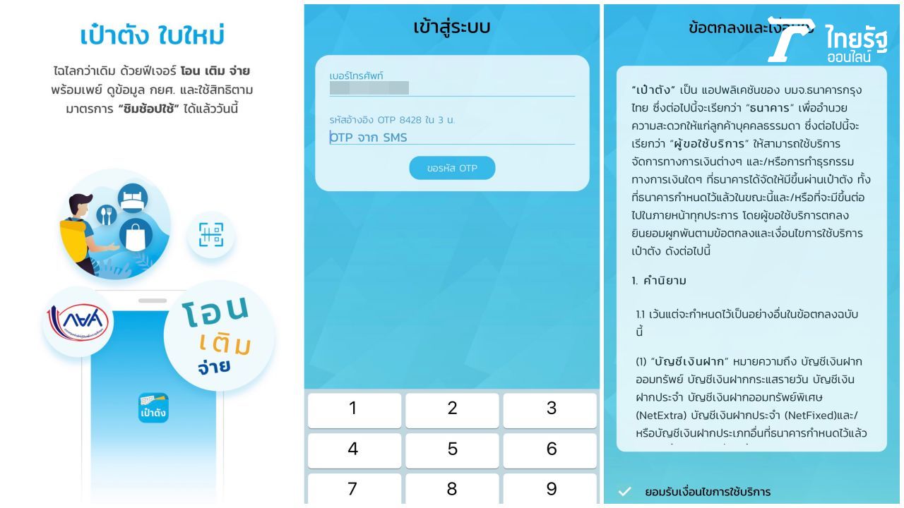 1. โหลดแอปฯ "เป๋าตัง" ใส่เบอร์โทรศัพท์มือถือ รอรับรหัส OTP ที่จะได้รับจาก SMS แล้วกรอกหมายเลขรหัส OTP