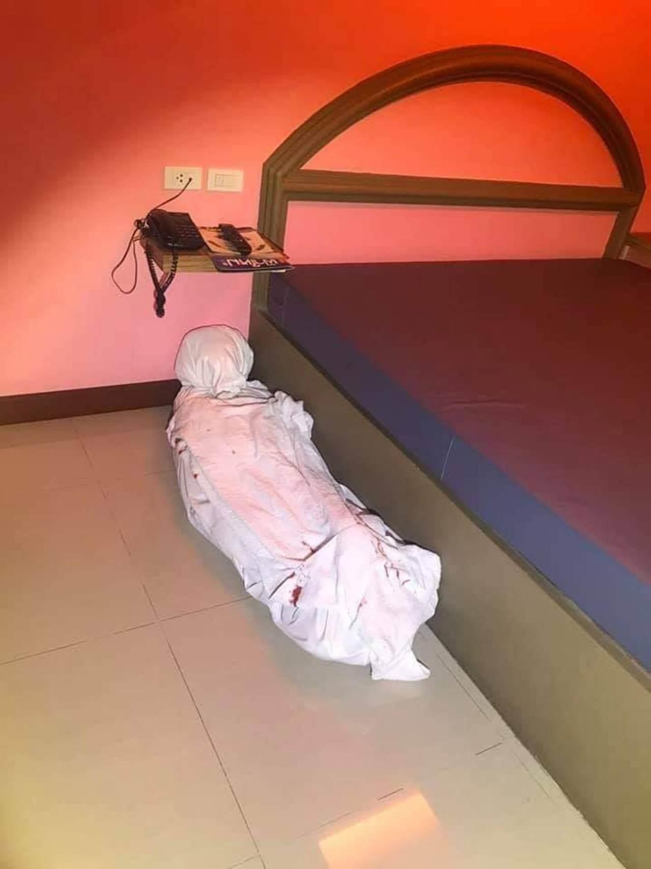 ทั้งนี้ ที่เกิดเหตุเป็นโรงแรมสูง 3 ชั้น ที่ชั้นล่างภายในห้อง V 3 ที่ข้างเตียงนอน พบห่อผ้าสีขาวลักษณะคล้ายห่อศพ ที่ใช้ผ้าปูที่นอนห่อวางไว้ข้างเตียง โดยมีคราบเลือดติดอยู่ที่บริเวณห่อผ้าและที่พื้นห้อง เจ้าหน้าที่ตำรวจจึงตรวจสอบพบผ้าปูที่นอนที่ห่อหมอนและผ้าเช็ดตัว 2 ผืน