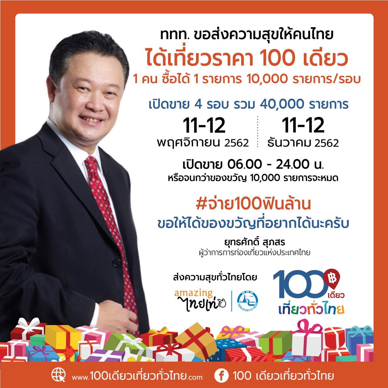 เมื่อวันที่ 6 พ.ย.62 นายยุทธศักดิ์ สุภสร ผู้ว่าการการท่องเที่ยวแห่งประเทศไทย (ททท.) กล่าวถึงการดำเนินงานตามโครงการ '100 เดียวเที่ยวทั่วไทย ว่าใกล้จะถึงวันลงทะเบียนร่วมกิจกรรม โครงการ 100 เดียวเที่ยวทั่วไทย ททท. ได้เตรียมของขวัญชุดใหญ่ ให้คนไทยได้เที่ยวในราคา 100 บาท โดยจะเปิดให้ ลงทะเบียนเคิวเลือกซื้อของขวัญตั้งแต่ 06.00 น.จนถึงเที่ยงคืนหรือจนกว่าของขวัญจะหมด ที่เว็บไซต์ www.100เดียวเที่ยวทั่วไทย.com
