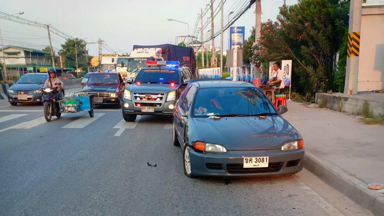 แต่ระหว่างที่ชายเสื้อขาวกำลังเจะปิดประตูได้มีรถบรรทุกสิบล้อ ยี่ห้อฮีโน่ หัวสีขาว ไม่ทราบหมายเลขทะเบียน ขับมาด้วยความเร็วเฉี่ยวชนรถเก๋งคันที่จอดท้าย แล้วมาเฉี่ยวชนรถเก๋งคันหน้า ก่อนจะชนร่างชายเสื้อขาวจนร่างกระเด็นกระแทกพื้น จากนั้นรถบรรทุกสิบล้อได้เร่งเครื่องออกเลนขวาหลบหนีไป