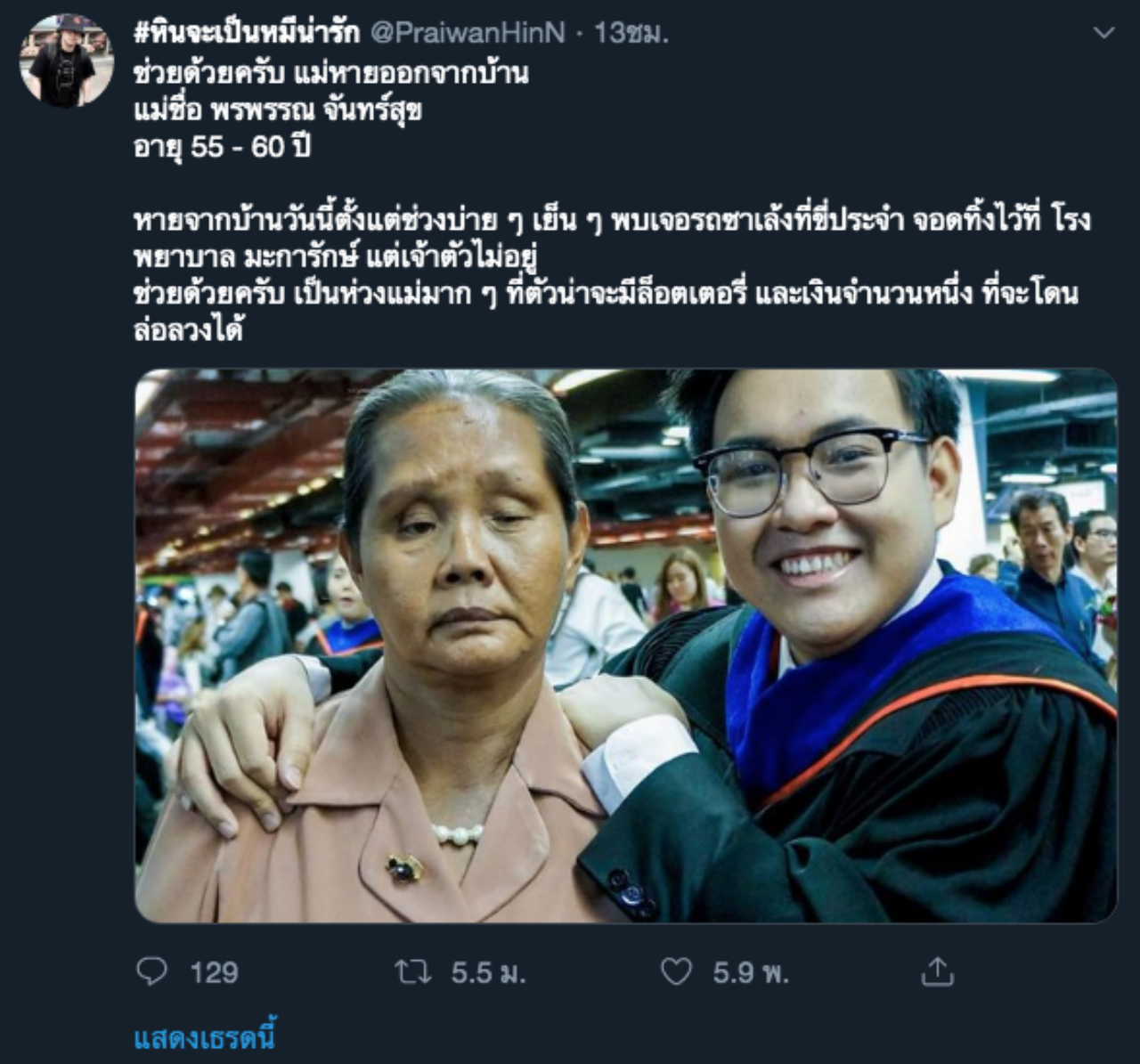 ผู้ใช้ทวิตเตอร์ชื่อ @PraiwanHinN โพสต์ข้อความตามหาแม่ พร้อมระบุข้อความว่า "ช่วยด้วยครับ แม่หายออกจากบ้าน แม่ชื่อพรพรรณ จันทร์สุข อายุ 55 - 60 ปี หายจากบ้านวันนี้ (9 พ.ย.) ตั้งแต่ช่วงบ่ายๆ พบเจอรถซาเล้งที่ขี่ประจำจอดทิ้งไว้ที่ โรงพยาบาลมะการักษ์ แต่เจ้าตัวไม่อยู่ ช่วยด้วยครับเป็นห่วงแม่มากๆ ที่ตัวน่าจะมีลอตเตอรี่ และเงินจำนวนหนึ่ง ที่จะโดนล่อลวงได้"