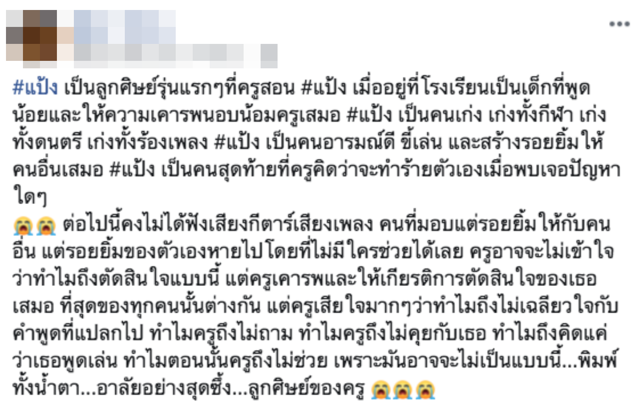 ขณะที่เพื่อนๆ ที่ทราบข่าว ก็ได้เขียนข้อความแสดงความเสียใจเป็นจำนวนมาก และไม่คิดว่า จะตัดสินใจแบบนี้ โดยครูของผู้เสียชีวิต ได้ขึ้นข้อความ แสดงความเสียใจ พร้อมระบุด้วยว่า ผู้เสียชีวิตเป็นคนเก่ง เก่งทั้งกีฬา ดนตรี อารมณ์ดี ขี้เล่น และสร้างรอยยิ้มให้คนอื่นเสมอ ก่อนหน้าผู้เสียชีวิตมีคำพูดที่แปลกไป แต่ตนก็ไม่ได้เฉลียวใจ