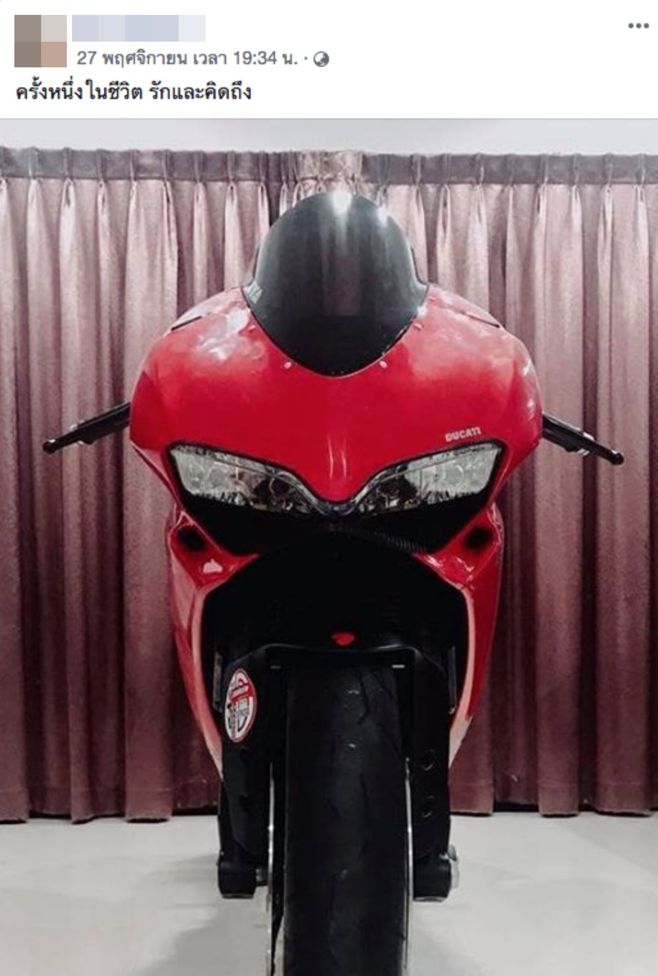 ทั้งนี้ เฟซบุ๊กของ น.ส.ปรียาภรณ์ เพียรงาม หรือ ครูแนน ผู้เสียชีวิตนั้น ได้โพสต์ข้อความสุดท้ายเมื่อเวลา 19.34 น. วันที่ 27 พ.ย.ที่ผ่านมา โดยได้โพสต์ภาพ รถบิ๊กไบค์ ยี่ห้อดูคาติ คันสีแดง พร้อมระบุข้อความว่า "ครั้งหนึ่งในชีวิต รักและคิดถึง"