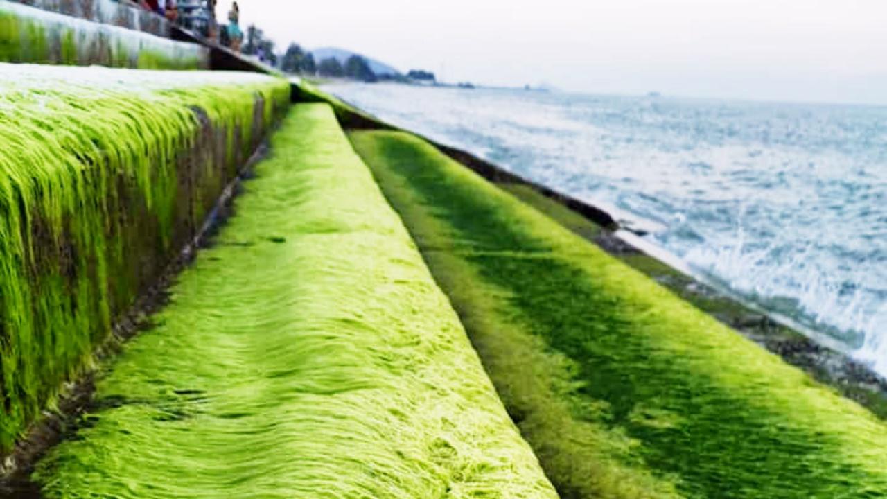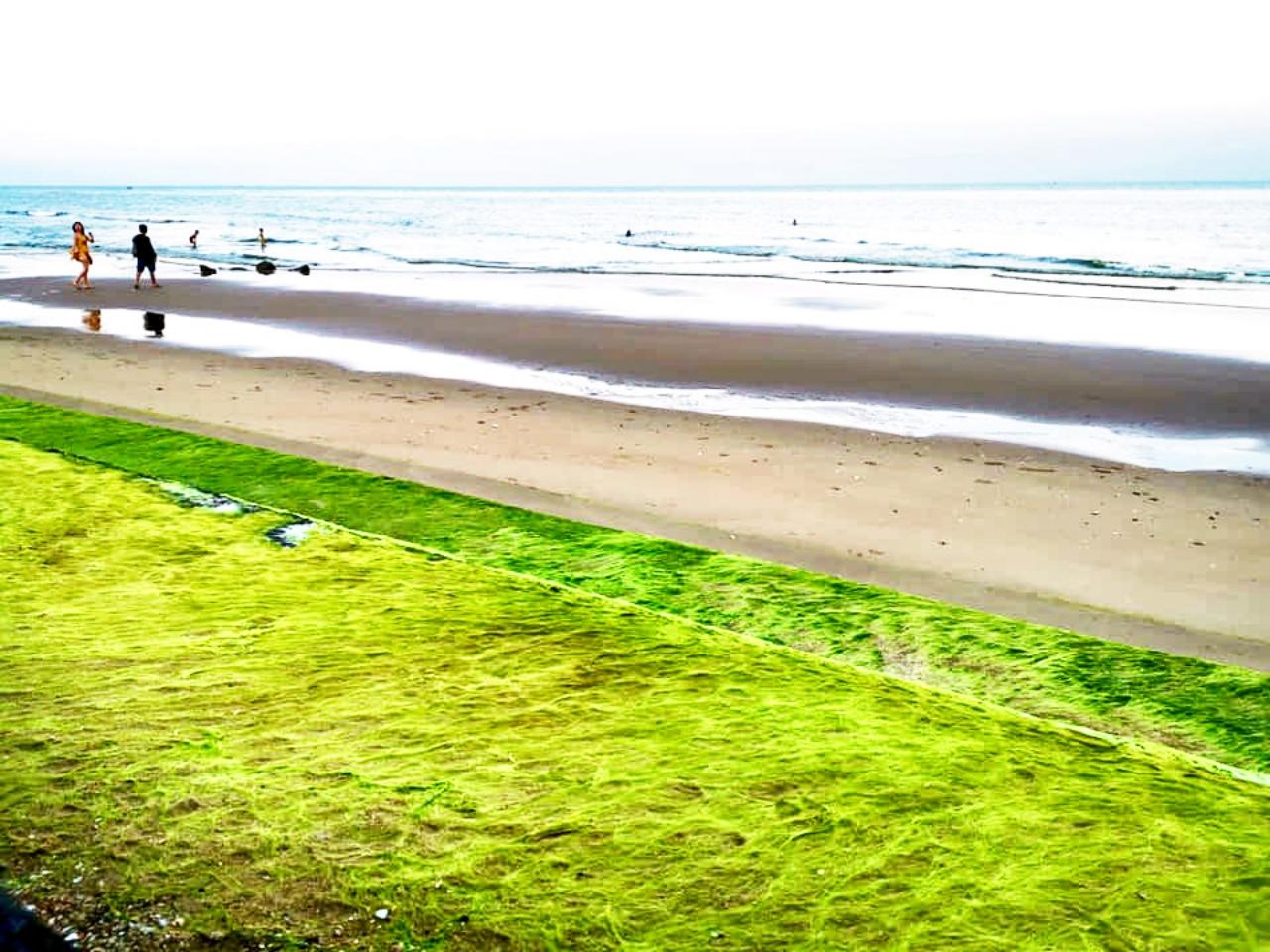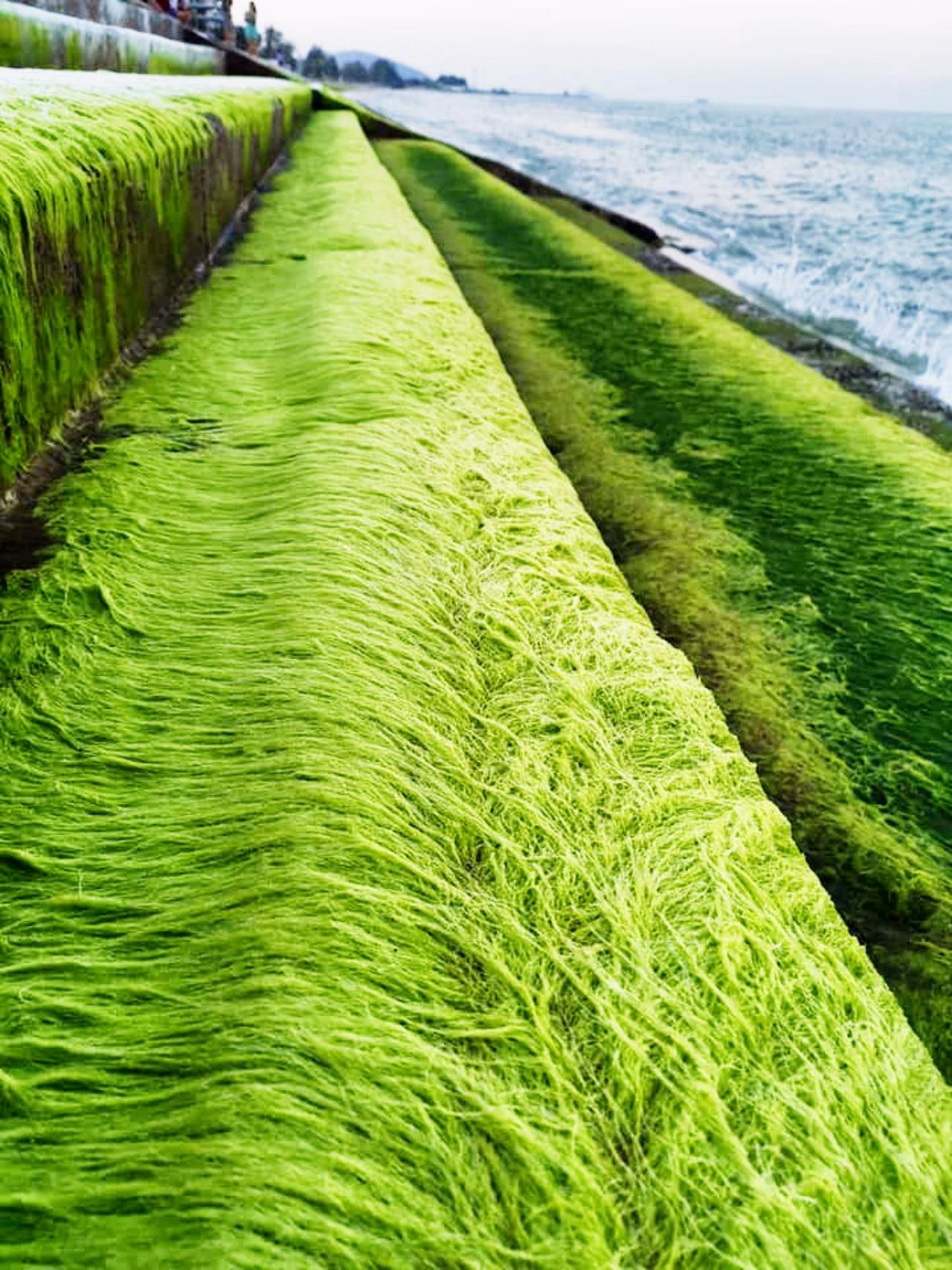 นักท่องเที่ยวแห่เก็บภาพประทับใจ "สาหร่ายสีเขียว" สวยงามแปลกตา ที่สันเขื่อนปากน้ำปราณ จ.ประจวบคีรีขันธ์ ขึ้นเองตามธรรมชาติ อีกไม่นานก็จะหายไปเอง