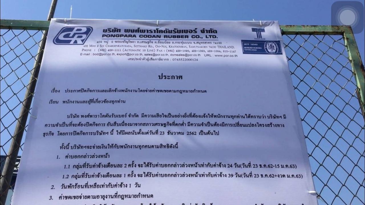 วันที่ 23 ธันวาคม 2562 ผู้สื่อข่าวรายงานว่า บริษัท พงศ์พาราโคดันรับเบอร์ จำกัด ซึ่งตั้งอยู่ อ.กระทุ่มแบน จ.สมุทรสาคร ได้บอกเลิกจากพนักงาน เกือบ 1,000 คน หลังพนักงานมาถึงหน้าบริษัทฯ แล้วไม่สามารถเข้าไปทำงานได้ เพราะทางโรงงานปิดประตูรั้วไว้อย่างแน่นหนา พร้อมกับติดป้ายประกาศปิดกิจการ และเลิกจ้างพนักงานโดยจ่ายค่าชดเชยตามกฎหมายกำหนด มีผลตั้งแต่วันนี้เป็นต้นไป ทำให้พนักงานเสียใจ เพราะเป็นการบอกเลิกจ้างแบบไม่ทันตั้งตัว ถือเป็นข่าวร้าย ก่อนหยุดฉลองปีใหม่ ที่กำลังจะมาถึง