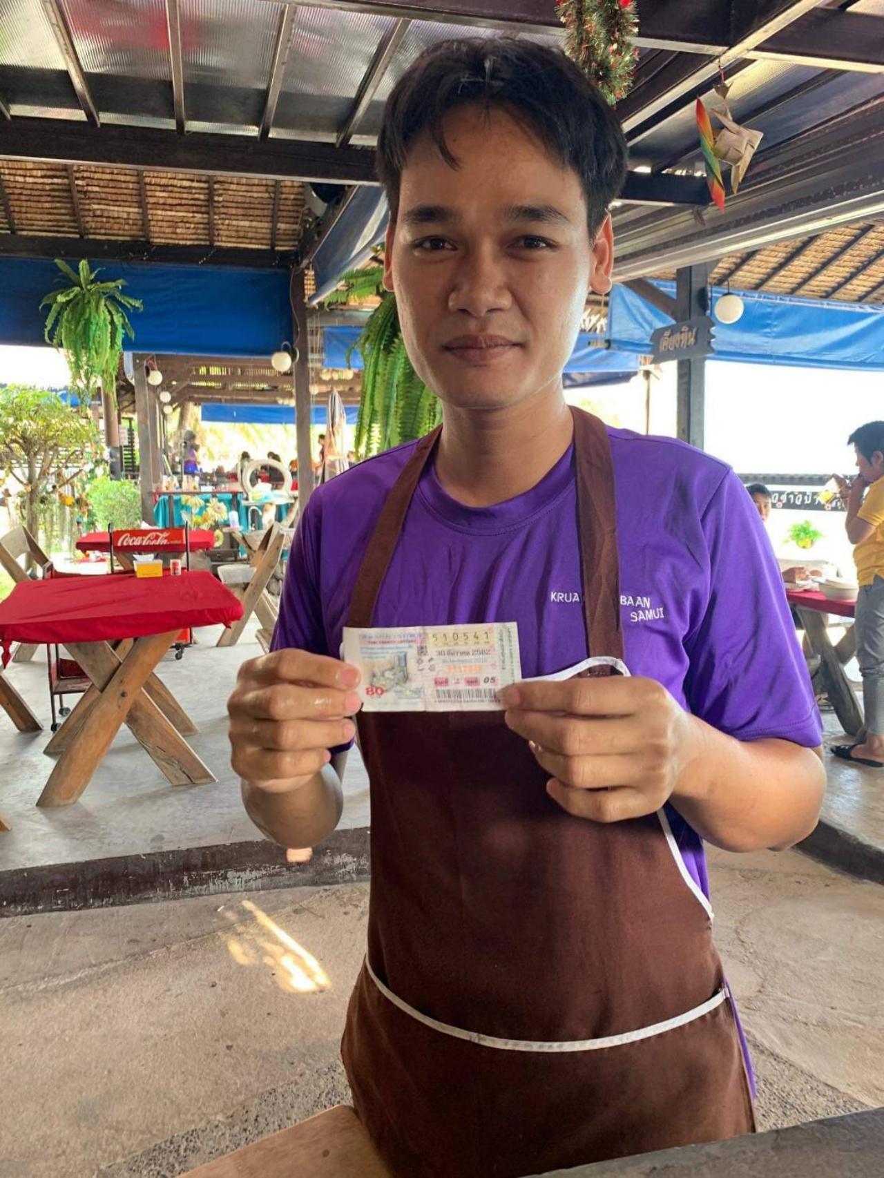 ซึ่งเจ้าตัวบอกว่า ตอนที่รู้ว่าตัวเองถูกรางวัลที่ 1 งวดประจำวันที่ 30 ธ.ค.2562 หมายเลข 510541 เฮลั่นห้องครัวเลย เงินที่ได้ก็ตั้งใจจะนำไปสร้างบ้านให้กับแม่ ที่ประเทศกัมพูชา และจะทำบุญครั้งใหญ่ให้กับพ่อที่เพิ่งเสียชีวิตไปไม่นาน ส่วนที่เหลือจะนำไปประกอบอาชีพ