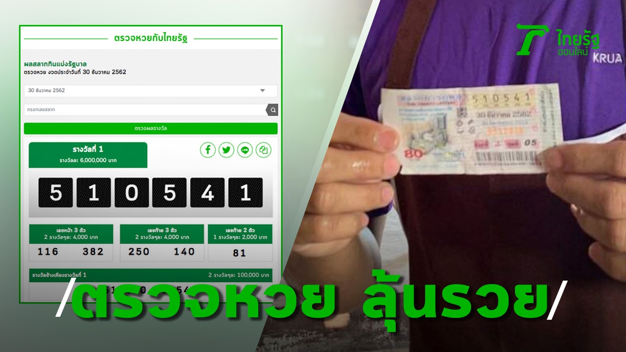 ตรวจหวยย้อนหลัง สลากกินแบ่งรัฐบาล งวดประจำวันที่ 30 ธันวาคม 2562 แสดงความยินดีเหล่าเศรษฐีใหม่ ถูกรางวัลที่ 1 ใครยังไม่ได้ตรวจลอตเตอรี่ อย่าช้า มีสิทธิ์รวย ส่งท้ายปีเก่า