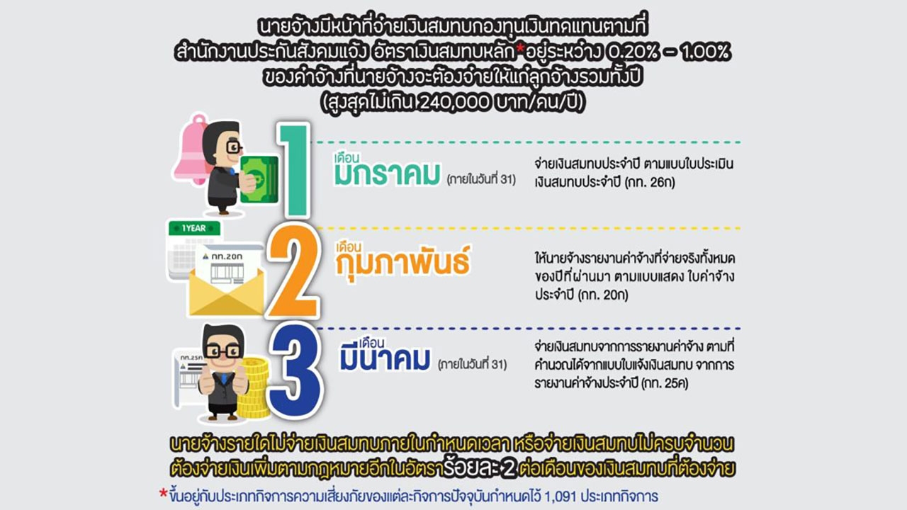 เมื่อวันที่ 11 ธันวาคม 2562 เลขาธิการสำนักงานประกันสังคม กระทรวงแรงงาน เปิดเผยว่า สำนักงานประกันสังคมได้ดำเนินการจัดส่งใบแจ้งการประเมิน เงินสมทบกองทุนเงินทดแทนประจำปี 2563 และแบบแสดงเงินค่าจ้างกองทุนเงินทดแทน ประจำปี 2562 ให้นายจ้างตั้งแต่เดือนธันวาคม 2562 ที่ผ่านมา เพื่อให้นายจ้างนำไปชำระเงินสมทบประจำปี 2563 โดยกำหนดชำระเงินสมทบกองทุนเงินทดแทนภายในวันที่ 31 มกราคม 2563 หากพ้นระยะเวลาที่กำหนด ต้องชำระเงินเพิ่มอีกร้อยละ 2 ต่อเดือนของจำนวนเงินสมทบที่ต้องจ่าย ในการชำระเงินสมทบกองทุนเงินทดแทน นายจ้างสามารถชำระเงินสมทบได้ที่ ธนาคารกรุงศรีอยุธยา จำกัด (มหาชน) และธนาคารกรุงไทย จำกัด (มหาชน) และบริษัท เคาน์เตอร์เซอร์วิส จำกัด หรือที่เทสโก้ โลตัส ทุกสาขา ทั่วประเทศ โดยทั้ง 4 แห่งจะออกใบเสร็จรับเงินให้ทันที