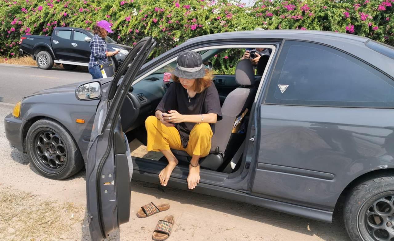 นางสาวเพ็ญพิสุทธิ์ กล่าวอีกว่า ตนตกใจมา จึงถีบป้าคนดังกล่าวไปหนึ่งที และรีบปิดประตูแล้วปิดกระจก ช่วงที่กระจกกำลังปิดขึ้น ป้าก็เอามือมากดกระจกไว้ มืออีกข้างก็ปาท่อนไม้มาใส่ในรถ ตนเลยแกะมือป้าออก กระจกขึ้นสุดแล้วป้าก็ยังพยายามเปิดประตูแล้วทุบกระจก เขาก็ยังเอามือ 2 ข้างมาเกาะกระจก แม้ตนจะขับรถออกไปแล้ว