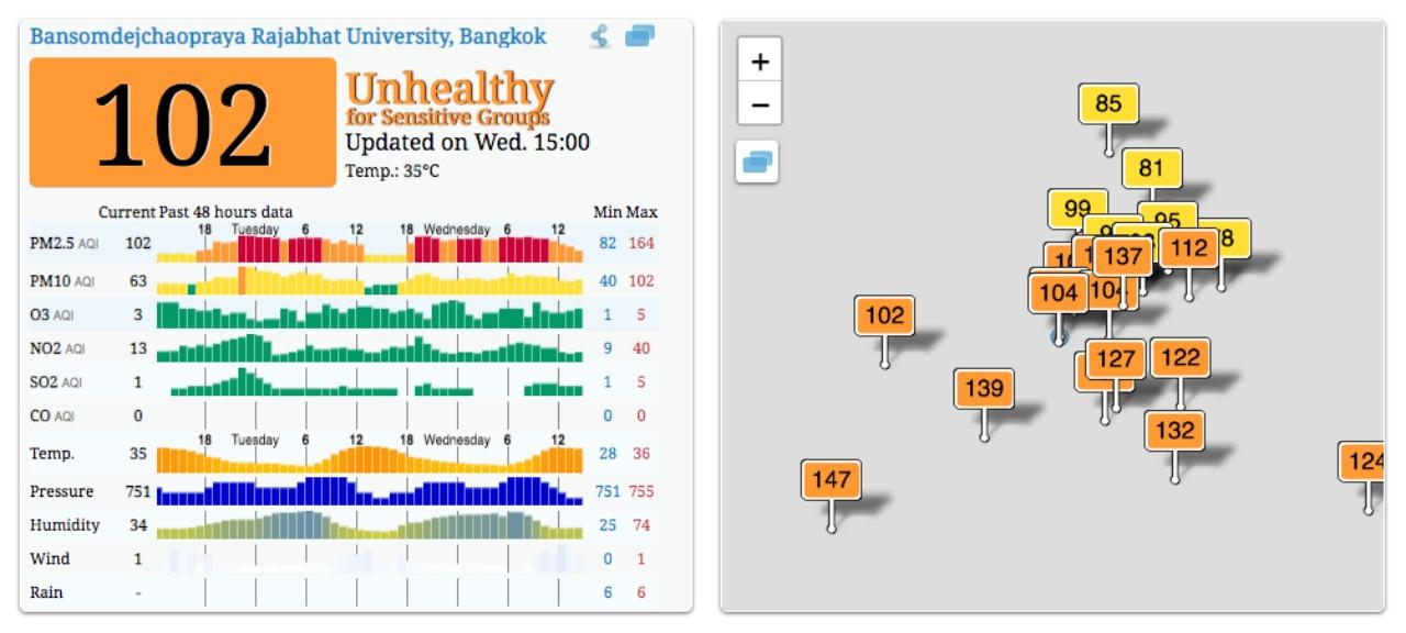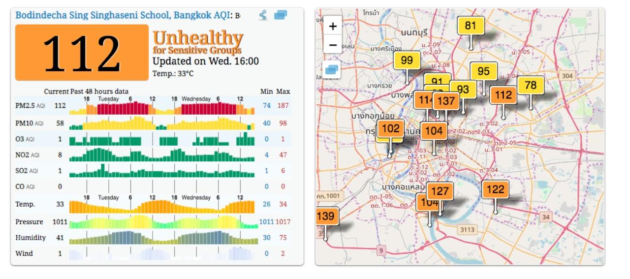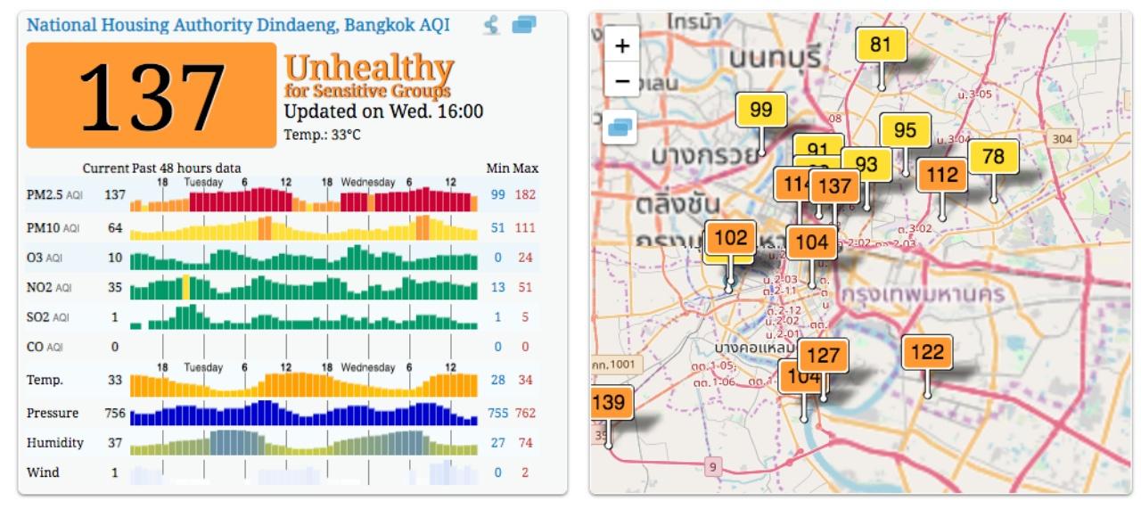 ขณะที่เว็บไซต์ aqicn.org รายงานคุณภาพอากาศในพื้นที่กรุงเทพฯ ในช่วงเย็น พบว่ามีหลายจุดที่น่าเป็นห่วง ได้แก่ จุดตรวจวัดการเคหะชุมชนดินแดง วัดค่าดัชนีคุณภาพอากาศสูงถึง 137, จุดโรงเรียนบดินทรเดชา (สิงห์ สิงหเสนี) วัดค่าดัชนีคุณภาพอากาศสูง 112 และ โรงไฟฟ้าพระนครใต้ วัดค่าดัชนีคุณภาพอากาศสูง 114.