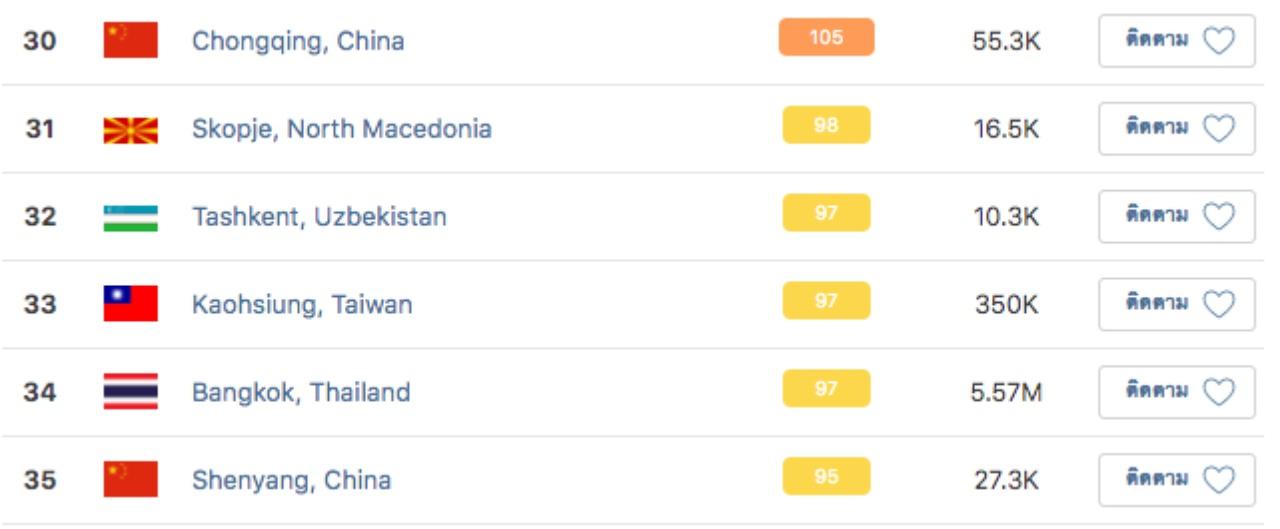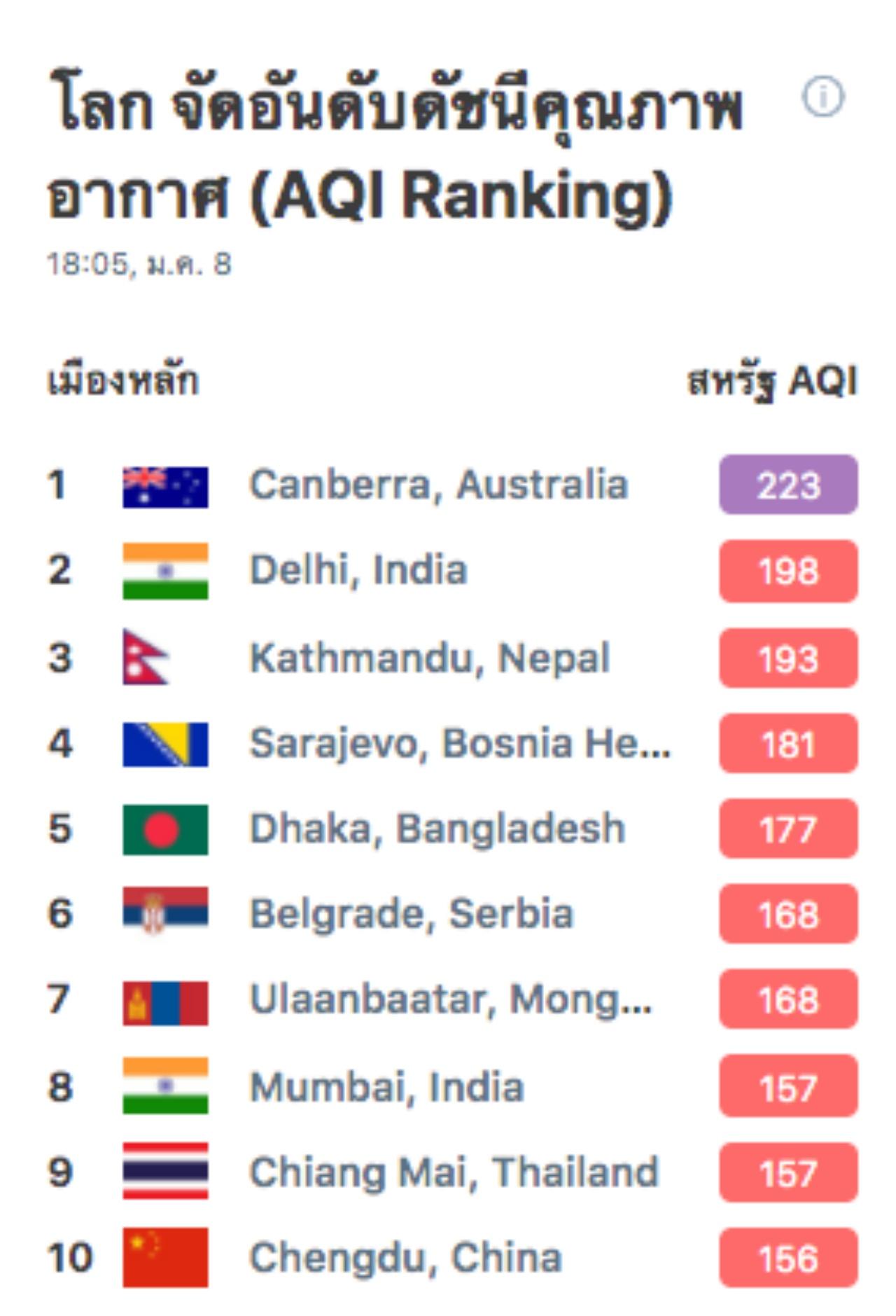 วันที่ 8 ม.ค.63 ผู้สื่อข่าวรายงานว่า เว็บไซต์ airvisual.com เผยการจัดอันดับคุณภาพอากาศและการจัดอันดับเมืองที่มีมลพิษ ตามมาตรฐาน US AQI เมื่อเวลา 18.05 น. พบว่า อันดับ 1 ได้แก่ แคนเบอร์รา ออสเตรเลีย อันดับ 2 เดลี อินเดีย อันดับ 3 กาฐมาณฑุ เนปาล ส่วน เชียงใหม่ ประเทศไทย อยู่ในอันดับที่ 9 และกรุงเทพฯ อยู่อันดับที่ 34