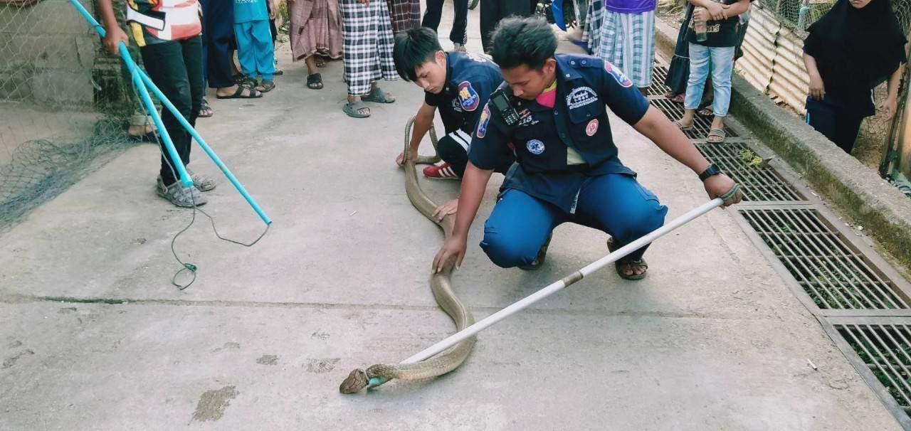 นายพีระพล ดือรือมอ อายุ 50 ปี ผู้พบเห็นคนแรก เล่าว่า ขณะที่นั่งเล่นอยู่บริเวณหน้าบ้าน ก็เห็นงูเลื้อยมาจากในคูน้ำแล้วเข้าไปใต้ถุนหลังบ้าน จึงเรียกเพื่อนบ้านมาดู ชาวบ้านบางคนก็บอกให้ตีเพราะปล่อยไว้จะเป็นอันตรายต่อเด็กและคนในหมู่บ้าน แต่บางคนก็บอกให้แจ้งกู้ภัย