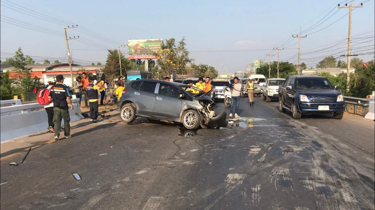 สาวขับเก๋งพุ่งชนสะพาน ลูกวัย 1 ขวบ กระเด็นออกนอกรถเจ็บสาหัส คาดตกใจรถคันหน้าหันหลบซากหมาที่นอนอยู่กลางถนน