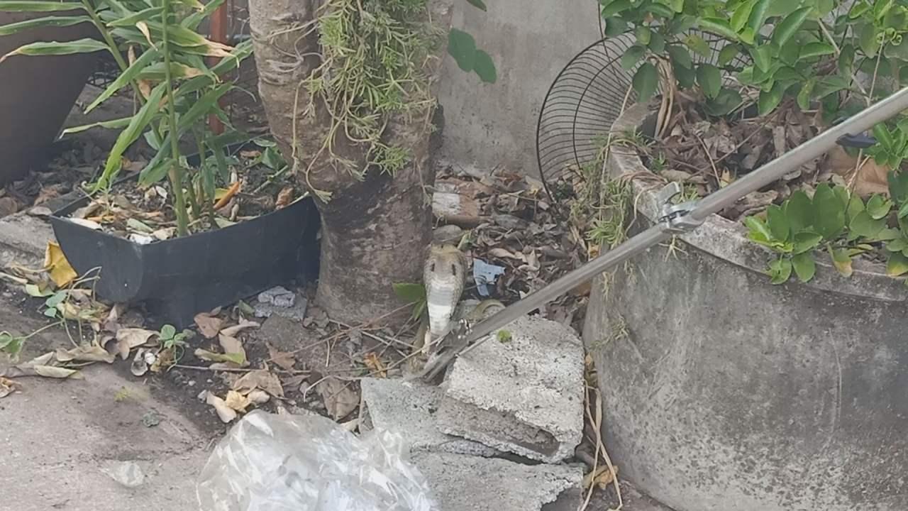นายพิทยา สุรัตนะ อายุ 47 ปี และนางอรทัย สุรัตนะ อายุ 45 ปี สามีภรรยาเจ้าของบ้าน นำชี้จุดที่พบงูเห่าที่หลบซ่อนตัวอยู่หลังท่อคอนกรีต ใต้ต้นมะยมบริเวณหน้าบ้าน พบเป็นงูเห่าดง กำลังรัดลูกหนูเพื่อกินเป็นอาหาร