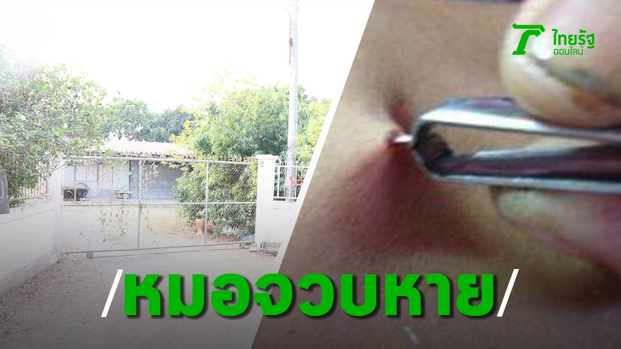เจ้าหน้าที่ตำรวจ เจ้าหน้าที่สาธารณสุข บุกบ้าน "หมอจวบ" ที่ใช้แหนบ-เข็มเย็บผ้า ดึงเส้นมะเร็ง รักษาโรคร้าย เจ้าหน้าที่ตะโกนเรียกแต่ไร้คนตอบรับ
