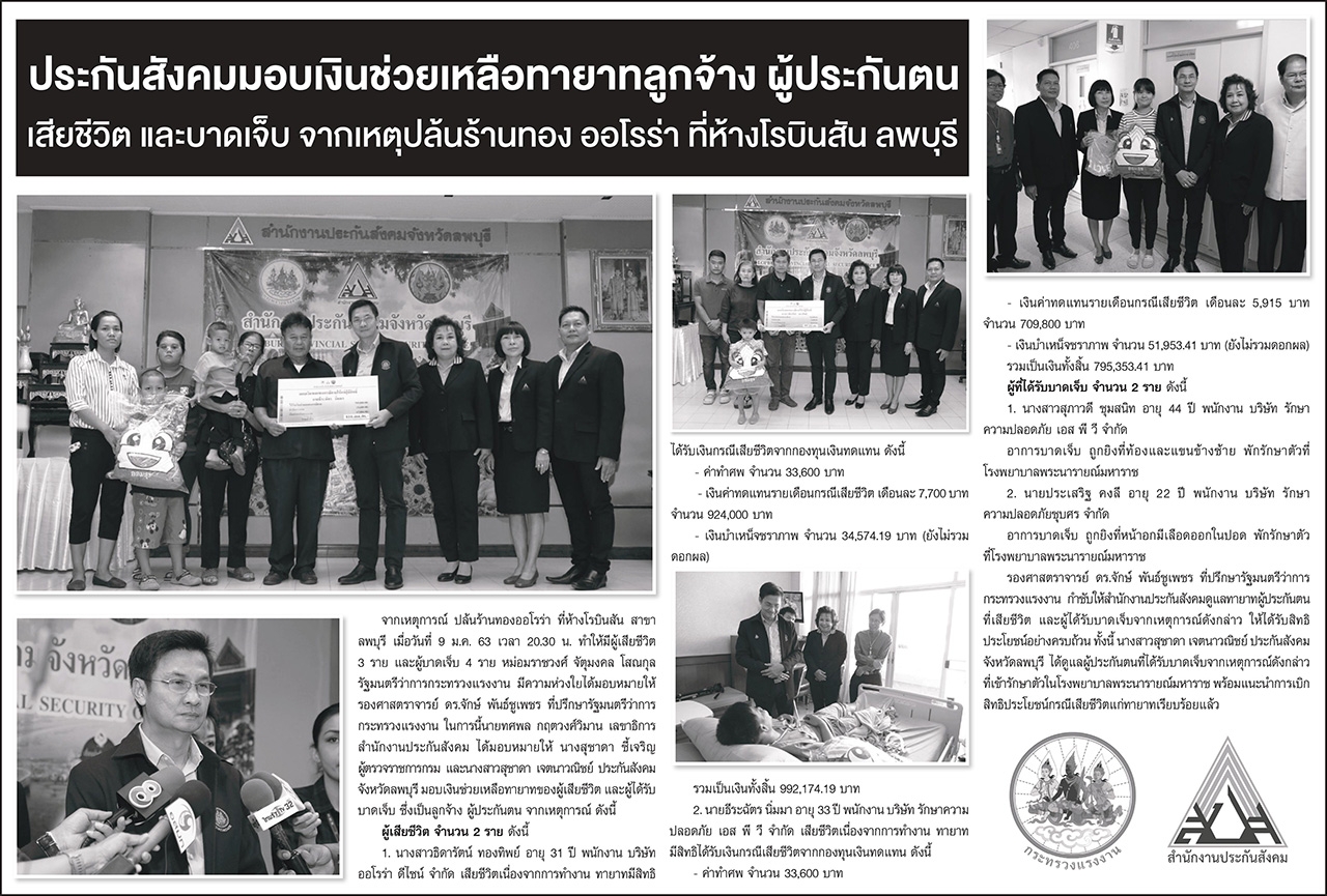 เรื่อง ประกันสังคมมอบเงินช่วยเหลือทายาทลูกจ้าง ผู้ประกันตน เสียชีวิต และบาดเจ็บ จากเหตุปล้นร้านทอง ออโรร่า ที่ห้างโรบินสัน ลพบุรี