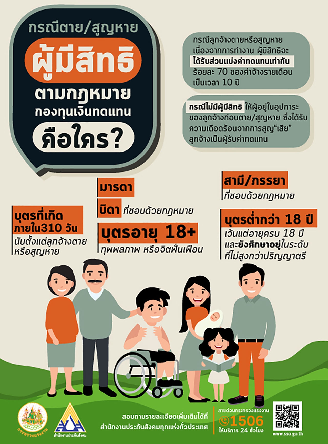 **ผู้มีสิทธิ ได้แก่ มารดา / บิดาตามกฎหมาย / สามีหรือภรรยาตามกฎหมาย / บุตรอายุไม่ถึง 18 ปี / บุตรที่ยังเรียนอยู่ไม่ถึงปริญญาตรี / บุตรอายุ 18 ปีขึ้นไป และทุพพลภาพหรือจิตฟั่นเฟือน / บุตรที่เกิดภายใน 310 วัน หลังจากลูกจ้างตายหรือสูญหาย