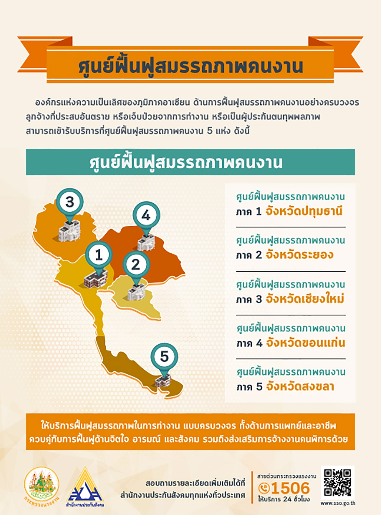 องค์กรแห่งความเป็นเลิศของภูมิภาคอาเซียน ให้บริการฟื้นฟูสมรรถภาพในการทำงานแบบครบวงจร โดยมีหน้าที่ฟื้นฟูสมรรถภาพด้านการแพทย์และอาชีพ ควบคู่กับการฟื้นฟูด้านจิตใจอารมณ์และสังคม การให้บริการปรึกษาแนะนำในการปรับสภาพจิตใจและ แนะแนวอาชีพ รวมถึงการให้บริการส่งเสริมการจ้างงานคนพิการด้วย โดยเจ้าหน้าที่ของศูนย์ฯ จะดูแลผู้เข้ามารับการฟื้นฟูอย่างเป็นกันเองและให้กำลังใจที่จะสู้ต่อ เพื่อให้ผู้ที่เข้ามารับการฟื้นฟูฯ กลับสู่สังคมอย่างมีความภาคภูมิใจ และสามารถต่อสู้เพื่อตนเองและครอบครัว ไม่ว่าจะเป็นการกลับเข้าทำงานในสถานประกอบการหรือประกอบอาชีพอิสระ ทั้งนี้เพื่อที่จะได้เป็นผู้ที่มีคุณภาพและคุณค่าต่อสังคมต่อไป มีทั้งหมด 5 แห่งด้วยกัน คือ ศูนย์ฟื้นฟูสมรรถภาพคนงานภาค 1 (จังหวัดปทุมธานี) ศูนย์ฟื้นฟูสมรรถภาพคนงานภาค 2 (จังหวัดระยอง) ศูนย์ฟื้นฟูสมรรถภาพคนงานภาค 3 (จังหวัดเชียงใหม่) ศูนย์ฟื้นฟูสมรรถภาพคนงานภาค 4 (จังหวัดขอนแก่น) และศูนย์ฟื้นฟูสมรรถภาพคนงานภาค 5 (จังหวัดสงขลา)