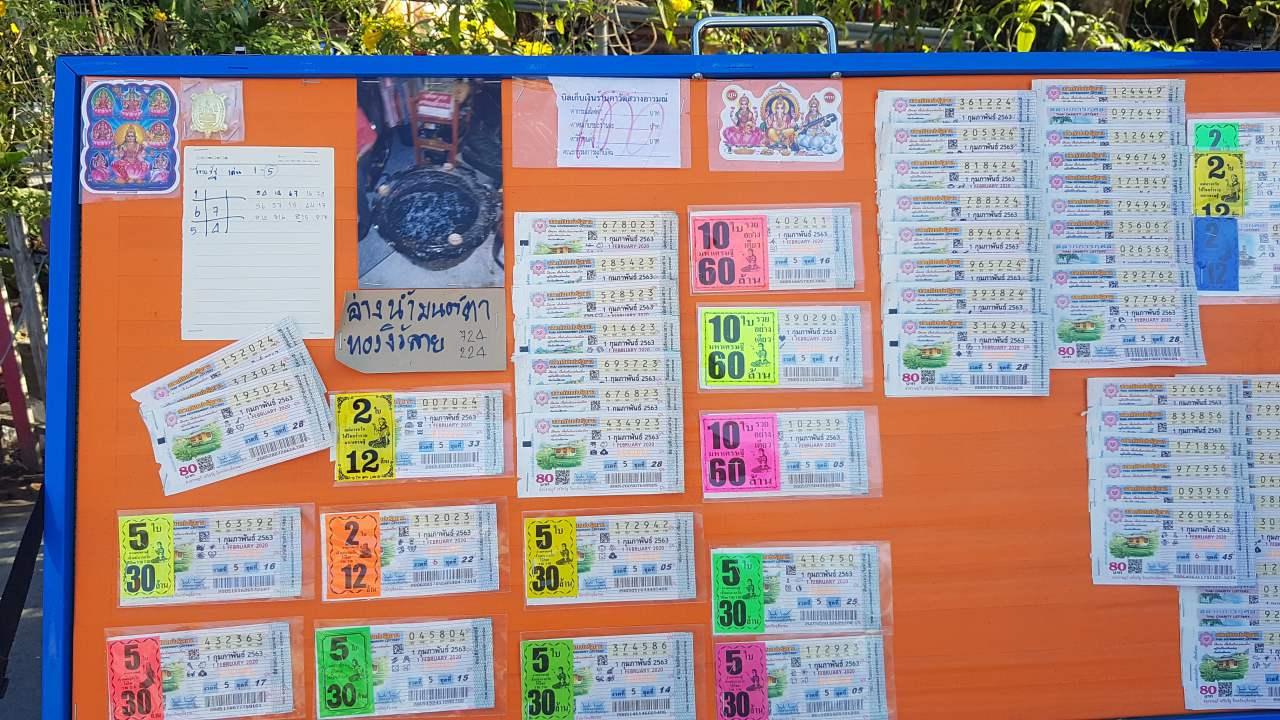 ส่วนที่คึกคักไม่แพ้กัน คือแผงลอตเตอรี่ ที่มาตั้งเรียงรายกว่า 100 แผง บรรดานักเสี่ยงโชค และสาธุชนต่างรุมล้อมกันเพื่อหาซื้อเลขที่ต้องการ ซึ่งหากบรรดานักเสี่ยงโชคไม่ได้ขึ้นดูในอ่างน้ำมนต์ ก็สามารถมาดูได้ที่แผงทุกแผง