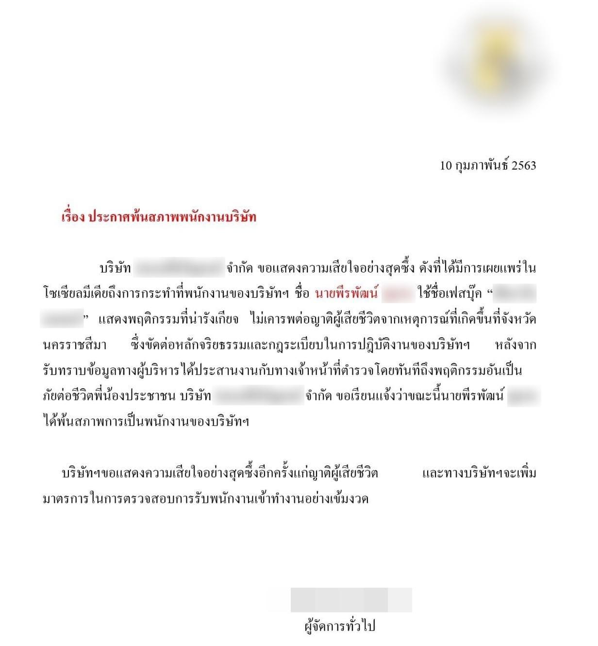 เกี่ยวกับเรื่องนี้ วันที่ 10 ก.พ.63 มีรายงานว่า บริษัทต้นสังกัดของหนุ่มรายดังกล่าวได้ประกาศว่า จากเหตุการณ์ที่เกิดขึ้นทั้งหมดนี้ ทางฝ่ายบริหารของบริษัทไม่นิ่งนอนใจกับสิ่งที่เกิดขึ้น ซึ่งมีผลกระทบต่อจิตใจของชาวชัยภูมิ และมีผลต่อเนื่องจากเหตุโศกนาฏกรรมที่จังหวัดนครราชสีมา ทางฝ่ายบริหารจึงได้มีมติเพื่อเป็นการรับผิดชอบต่อสังคม แจ้งให้นายพีระพัฒน์พ้นสภาพจากการเป็นพนักงานของบริษัท ซึ่งมีผลนับจากวันนี้เป็นต้นไป