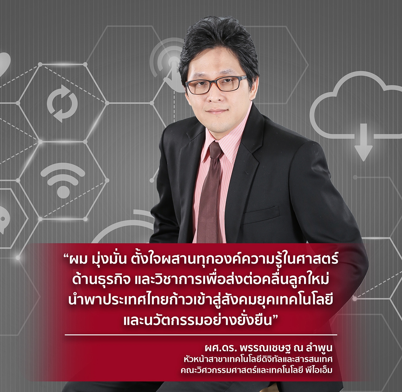 ผู้ช่วยศาสตราจารย์ ดร. พรรณเชษฐ ณ ลำพูน หัวหน้าสาขาเทคโนโลยีดิจิทัลและสารสนเทศ คณะวิศวกรรมศาสตร์และเทคโนโลยี พีไอเอ็ม ปริญญาโท สาขาวิศวกรรมคอมพิวเตอร์ จาก Polytechnic Institute of New York University พ่วงด้วยปริญญาเอกสถาบันระดับเอเชีย จากสถาบันเทคโนโลยีแห่งเอเชีย (AIT) กล่าวว่า “ต้องการให้สาขาเทคโนโลยีดิจิทัลและสารสนเทศ ยกระดับหลักสูตรในเชิงรุก นักศึกษาที่จบไปสามารถประกอบอาชีพได้หลากหลาย เราจึงคุยกับสถานประกอบการในแวดวงอุตสาหกรรมดิจิทัลว่า ทิศทางความต้องการของงานในอนาคตเป็นอย่างไรผนวกกับแนวโน้มการพัฒนาประเทศ ผลก็คือ งานด้านการพัฒนาโปรแกรม ด้านสื่อกราฟิก ด้านวิทยาการข้อมูล ระบบ Cloud กำลังมาแรง นี่จึงเป็นเหตุผลว่า จะเรียนไอทีอย่างเดียวคงไม่พอ เราจะเน้นหนักไปกับสื่อดิจิทัลและจะเทรนนิ่งให้นักศึกษาเน้นการลงมือปฏิบัติจริง รวมถึงมีความสามารถใช้เครื่องมือด้านกราฟิกได้อย่างเชี่ยวชาญ เช่น Software ที่นิยมในปัจจุบัน สำหรับวิชาวิทยาการข้อมูล (Data Science) เป็นอีกหนึ่งวิชาที่เพิ่มขึ้นในหลักสูตร นักศึกษาจะได้เรียนครบตั้งแต่การเก็บข้อมูล การทำความสะอาดข้อมูล การสกัดคุณลักษณะข้อมูล การสร้างแบบจำลองเพื่อทำนายหรือจำแนกข้อมูล การจัดกลุ่มข้อมูล รวมไปถึงการสร้างรายงานและการนำเสนอข้อมูลในรูปแบบต่างๆ ก่อให้เกิดประโยชน์ต่อการทำงานในอนาคต และอีกหนึ่งโปรแกรมที่น่าสนใจ คือ 3D Animation เน้นให้เก่งแอนิเมชัน สร้างตัวละครได้ มีไอเดียการเล่าเรื่อง ดึงความรู้สึกของตัวละครออกมานำเสนอได้ ตัวอย่างที่ประสบความสำเร็จด้านนี้ คือ นักศึกษาชั้นปีที่ 4 ที่ไปคว้าแชมป์แอนิเมชัน “โครงการ Software Park – Wealth Magik เงินออมสร้างชาติ Awards Season 4” ซึ่งเป็นการ์ตูนเผยแพร่ความรู้ด้านการเงิน เรียนรู้การนำเทคโนโลยีมาเป็นเครื่องมือช่วยบริหารเงินออมให้งอกเงย”