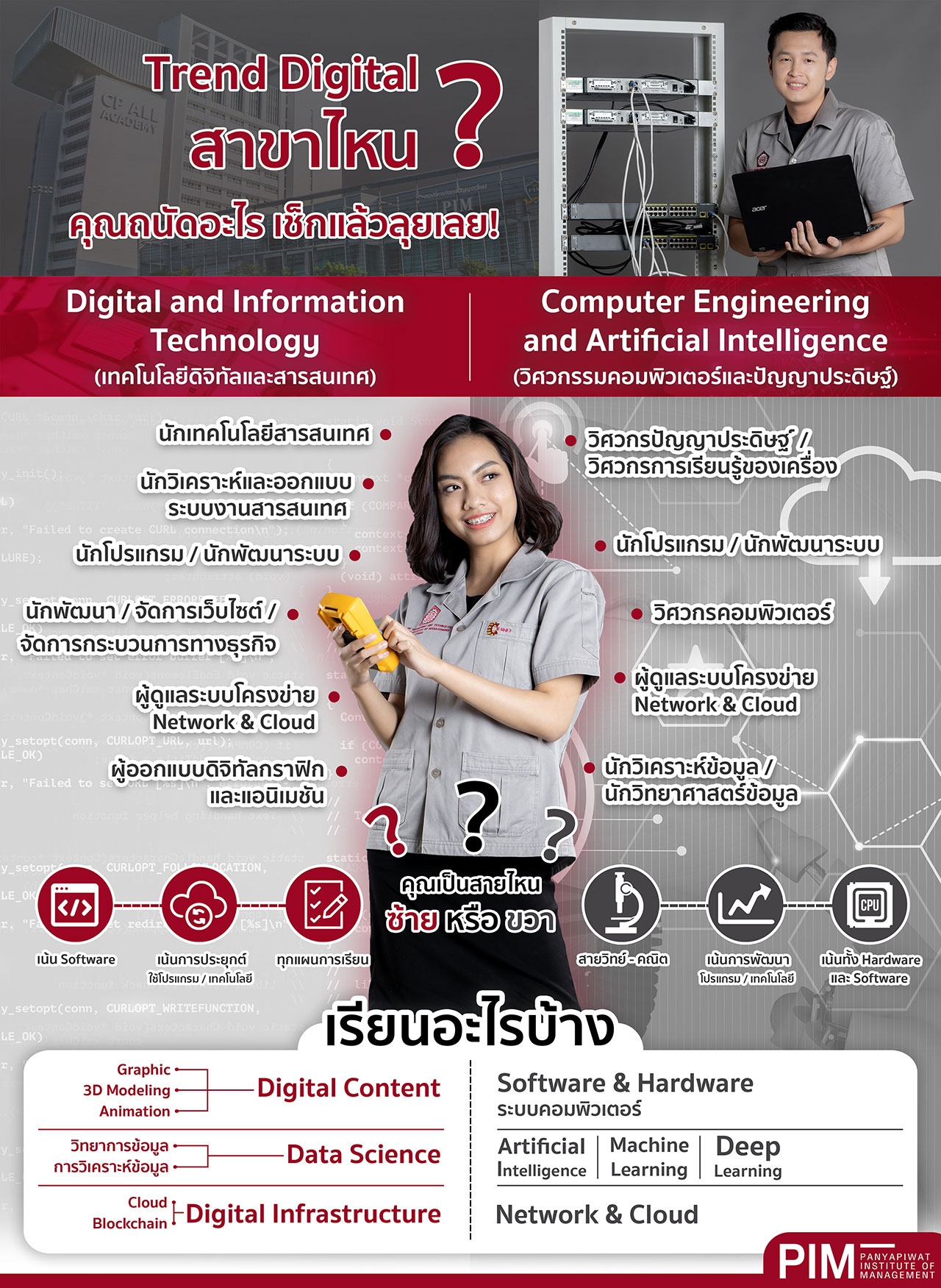 คำว่า “IT” จึงกลายเป็นคำที่ General สำหรับยุคนี้ พีไอเอ็มจึงยกคุณภาพหลักสูตรให้นักศึกษาสามารถต่อยอดเชิงธุรกิจทันกระแสของอุตสาหกรรมในอนาคต “New S-curve” ตอบโจทย์ที่รัฐบาลต้องการให้มีการขับเคลื่อนและทำทุกกระบวนการให้เป็นดิจิทัลมากขึ้น โดยเฉพาะอย่างยิ่งตลาดแรงงานอย่างเขตพัฒนาพิเศษภาคตะวันออก (EEC) งานด้านดิจิทัลจะมีความต้องการเพิ่มมากขึ้นในปี 2562 – 2566 ถึง 25% โดยเฉพาะด้านดิจิทัลคอนเทนต์ เช่น แอนิเมชัน เว็บไซต์ กราฟิก ทั้งเกมเพื่อสนุกสนานทั่วไปและเกมที่สนับสนุนธุรกิจ เกมต่างๆ ในแอปพลิเคชัน ตัวละคร 3D หรือ ซอฟต์แวร์เฮ้าส์ มาใช้ทำสื่อให้แก่องค์กรทำให้มีมูลค่ามากขึ้น เนื่องจากอุตสาหกรรมบางอย่างต้องใช้สื่อเหล่านี้ในการทำประชาสัมพันธ์ หรือเป็นสื่อการสอนให้กับพนักงานในองค์กร คณะวิศวกรรมศาสตร์และเทคโนโลยีที่พีไอเอ็ม เรามุ่งเน้นให้นักศึกษาได้ช็อปปิ้ง และลองเลือกเรียนสาขาวิชาที่เขาชอบเพื่อค้นหาตัวเอง สร้างแพสชันในการเรียนและรู้เป้าหมายของอาชีพให้มากขึ้น เช่น โปรแกรม Java, Digital Infrastructure, AI, Blockchain, Cloud, และ IoT มีความพร้อมสู่อาชีพงานใหม่ๆ ของคนในอนาคต เช่น ดูแลระบบโครงข่าย Network & Cloud, ผู้ออกแบบดิจิทัลกราฟิก และแอนิเมชันนักวิเคราะห์ข้อมูล นักวิทยาการข้อมูล”