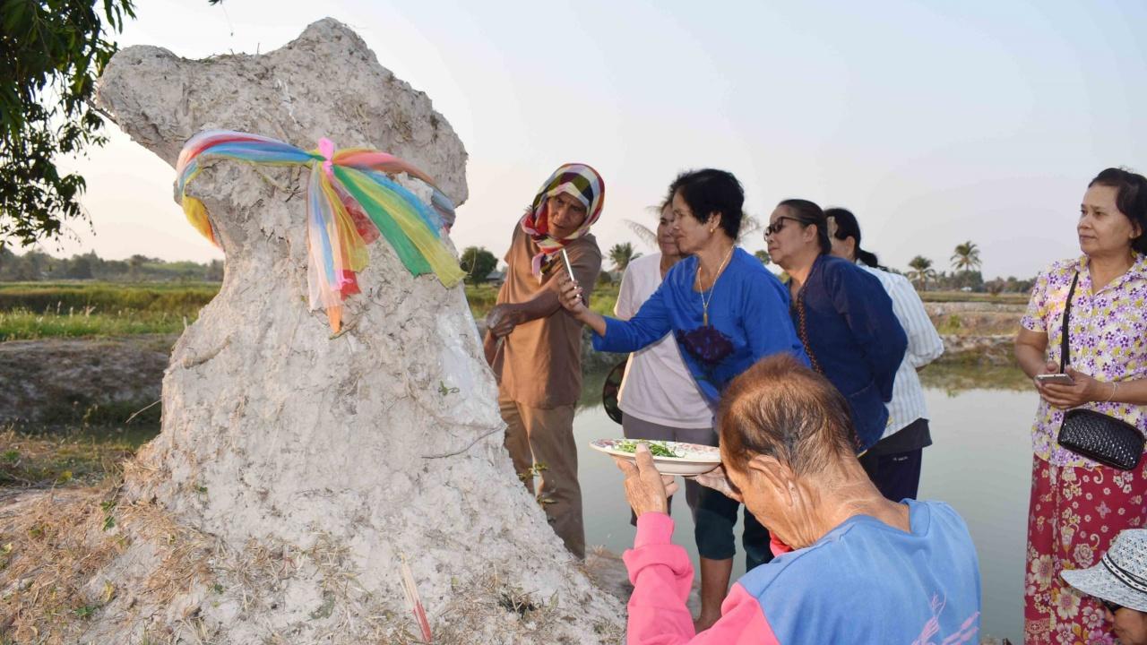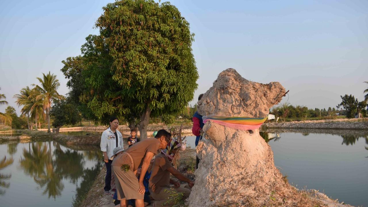 วันที่ 15 ก.พ. 2563 ผู้สื่อข่าวรายงานว่า ที่บ่อเลี้ยงกุ้งก้ามกราม ของนายอัมพร ภูนาโคก ชาวบ้านตูม หมู่ 4 ต.บัวบาน อ.ยางตลาด จ.กาฬสินธุ์ ซึ่งอยู่ใกล้เขตโนนบ้านเก่า หรือบริเวณที่ตั้งชุมชนสมัยโบราณ มีชาวบ้านกลุ่มหนึ่ง นำผ้าแพร 7 สี พร้อมดอกไม้ธูป-เทียน มาทำพิธีแก้บนและอธิษฐานขอหวยจอมปลวก ที่ก่อตัวเป็นรูปร่างคล้ายหัวราชสีห์กลางบ่อเลี้ยงกุ้งก้ามกราม โดยใช้แป้งฝุ่นโรยและลูบไล้หาตัวเลขที่ปรากฏบนผิวจอมปลวก