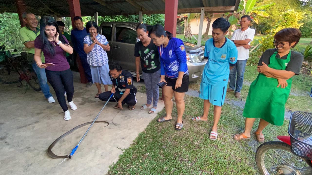 โดยพบว่าเป็นงูเห่า ตัวเขื่อง สีดำ ขนาดความยาวประมาณ 2 เมตร อยู่ในสภาพอ่อนแรง คาดว่าเพราะฤทธิ์ของยาฆ่าแมลงที่เจ้าของบ้านฉีดพ่นใส่ จากนั้นเจ้าหน้าที่ได้นำใส่กระสอบก่อนนำไปปล่อยคืนสู่ธรรมชาติ ในที่ห่างไกลบ้านผู้คนต่อไป