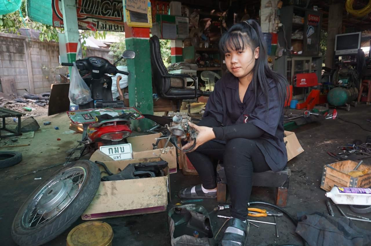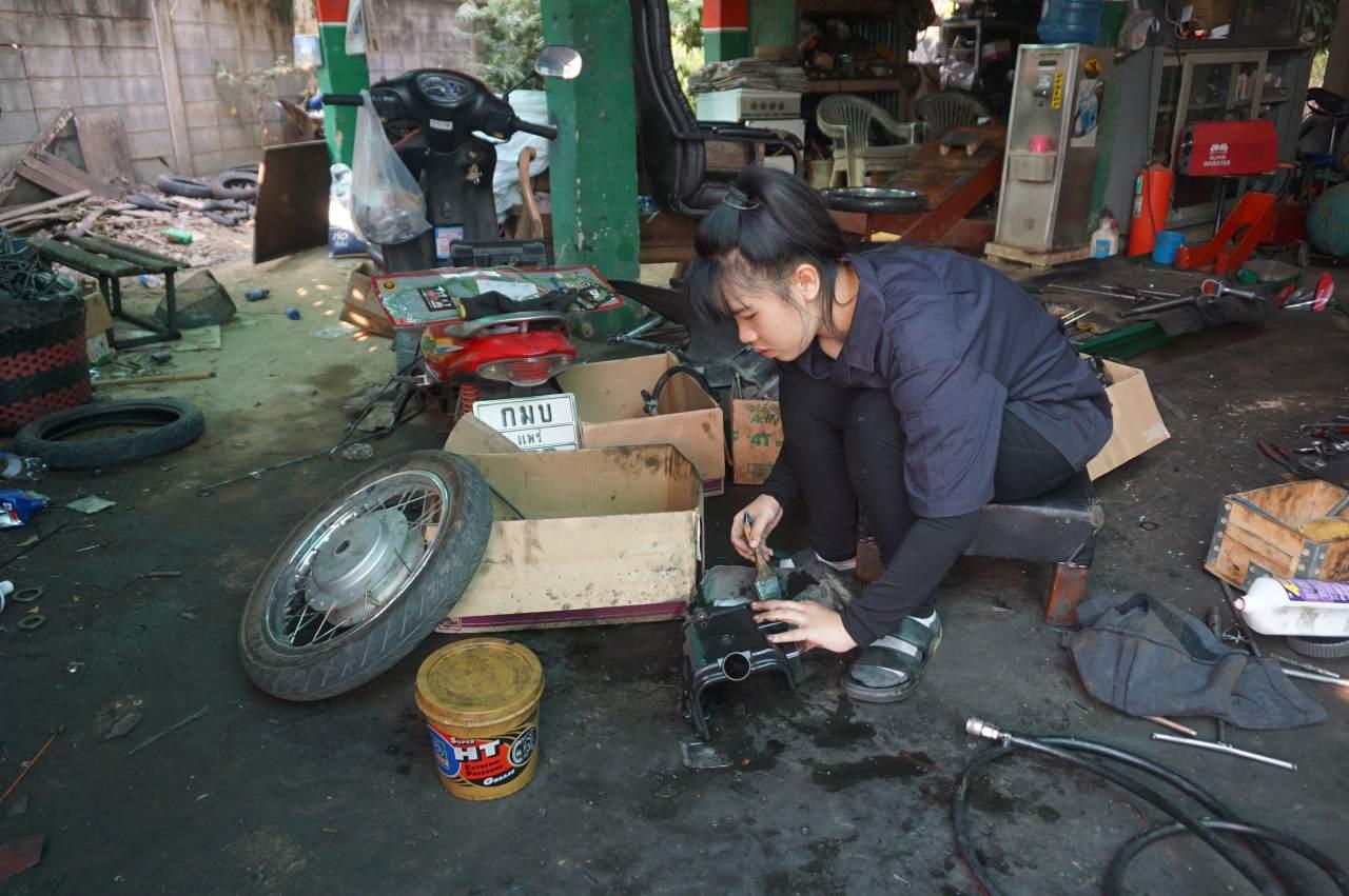 น้องเจน เล่าว่า ที่มาทำงานช่างซ่อมรถช่วยครอบครัว เพราะเคยทำงานเป็นผู้ช่วยพยาบาล แต่ต้องเดินทางไกล จึงได้ตัดสินใจออกมาช่วยครอบครัว การซ่อมรถ คุ้นเคยมานาน เพราะช่วยพ่อทำงานมาตั้งแต่เด็ก จึงรักในการซ่อมรถ อีกอย่างหนึ่งคือ ทำแล้วสบายใจ ได้อยู่ใกล้ครอบครัว ได้ดูแลพ่อและแม่