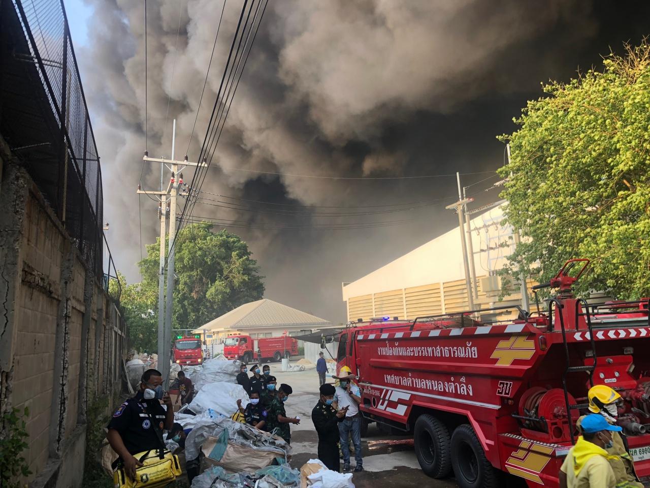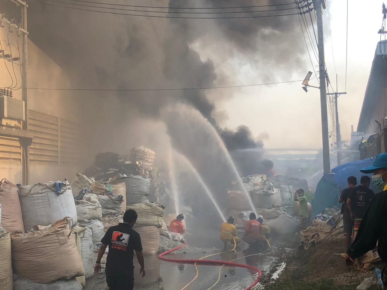 ไฟไหม้โรงงานรีไซเคิล พบต้นเหตุมาจากการเผาหญ้าข้างบริษัท จนโกดังวอดทั้งหลัง พนักงานกว่า 300 คน แตกตื่นวิ่งหนีตาย ระดมฉีดน้ำอย่างต่อเนื่อง