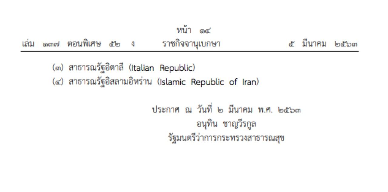 ราชกิจจาฯ ประกาศให้ เกาหลี จีน อิตาลี และอิหร่าน เป็นท้องที่นอกราชอาณาจักรที่เป็นเขตติดโรคติดต่ออันตรายกรณี "โควิด-19"