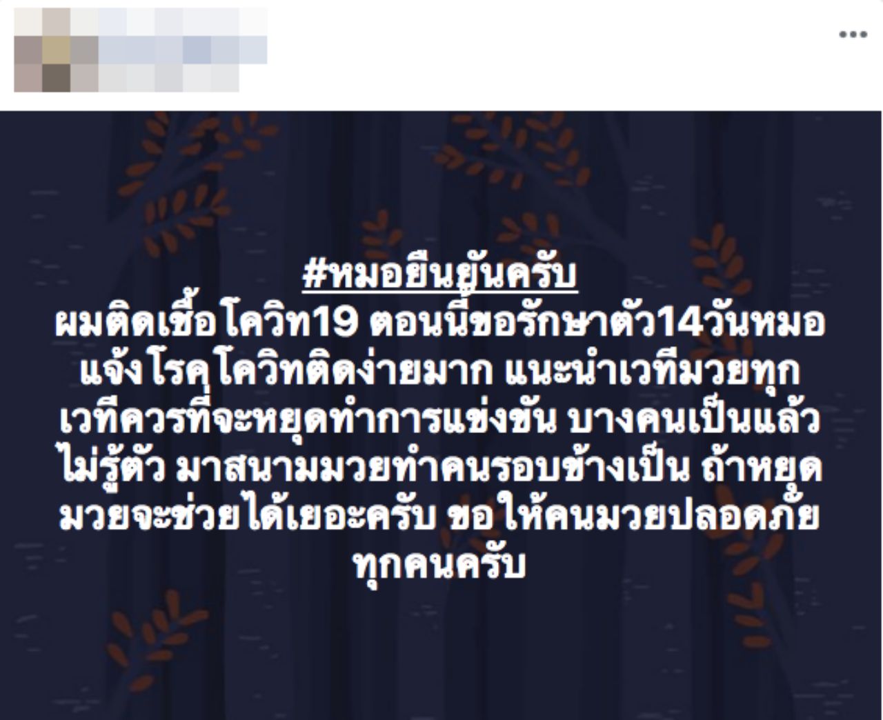 นอกจากนี้ เซียนมวยคนดังกล่าวยังได้แชร์ข้อความของเพื่อนเซียนมวยอีกคนที่ระบุว่า "#หมอยืนยันครับ ผมติดเชื้อโควิด-19 ตอนนี้ขอรักษาตัว14วัน หมอแจ้งโรคโควิดติดง่ายมาก แนะนำเวทีมวยทุกเวทีควรที่จะหยุดทำการแข่งขัน บางคนเป็นแล้วไม่รู้ตัว มาสนามมวยทำคนรอบข้างเป็น ถ้าหยุดมวยจะช่วยได้เยอะครับ ขอให้คนมวยปลอดภัยทุกคนครับ"