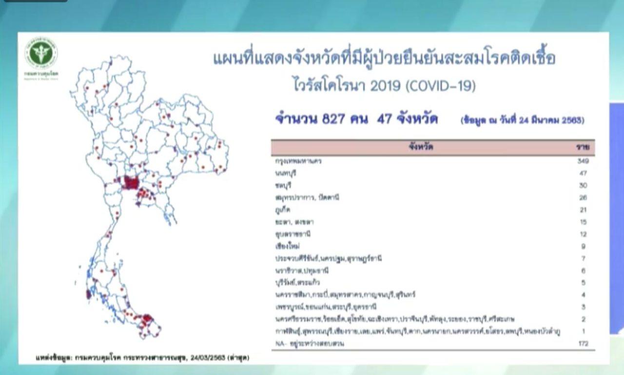 เมื่อวันที่ 24 มี.ค. 63 นายแพทยทวีศิลป์ วิษณุโยธิน โฆษกกระทรวงสาธารณสุข แถลงสถานการณ์โควิด-19 โดยวันนี้ (24 มี.ค.) พบผู้ติดเชื้อรายใหม่เพิ่ม 106 ราย ส่งผลให้มีผู้ป่วยสะสม ผู้ป่วยสะสมเพิ่ม 827 ราย และมีผู้เสียชีวิต เพิ่ม 3 ราย รวมทั้งสิ้น 4 ราย