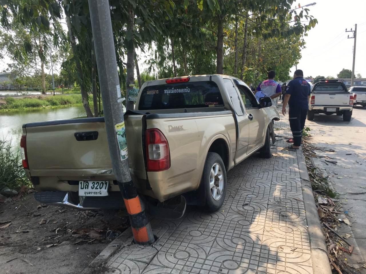 โดยที่เกิดเหตุ พบรถยนต์กระบะยี่ห้ออีซูซุ สีบรอนซ์เทา หมายเลขทะเบียน บล 3201 อุบลราชธานี ด้านหน้ากระจกรถ เขียนว่า พระคุณพ่อแม่ บริเวณแก้มรถด้านซ้าย ด้านหน้ารถกระบะมีร่องรอยเฉี่ยวชนกับต้นไม้ ยางหน้ารถแตกทั้งสองข้าง ด้านหน้ารถพังยับ ไฟหน้าแตกกระจัดกระจาย หลังกระบะท้ายด้านขวาอัดชนเสาไฟฟ้าริมถนนได้รับความเสียหาย ไม่สามารถขับเคลื่อนรถออกมาได้ โชคยังดีที่ยังไม่ตกลงไปในคลองข้างถนน