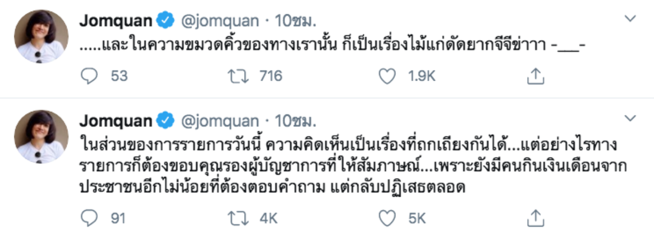 อย่างไรก็ตาม หลังจากที่จบรายการ แฮชแท็ก #ถามตรงๆกับจอมขวัญ พุ่งติดเทรนด์ทวิตเตอร์ ตั้งแต่เมื่อวานนี้ ขณะที่ จอมขวัญ ได้ทวีตข้อความ เกี่ยวกับการสัมภาษณ์ ผ่านทวิตเตอร์ @jomquan ว่า "ในส่วนของการรายการวันนี้ ความคิดเห็นเป็นเรื่องที่ถกเถียงกันได้...แต่อย่างไร ทางรายการก็ต้องขอบคุณรองผู้บัญชาการที่ให้สัมภาษณ์...เพราะยังมีคนกินเงินเดือนจากประชาชนอีกไม่น้อยที่ต้องตอบคำถาม แต่กลับปฏิเสธตลอด และในความขมวดคิ้วของทางเรานั้น ก็เป็นเรื่องไม้แก่ดัดยากจีจีข่าาา"