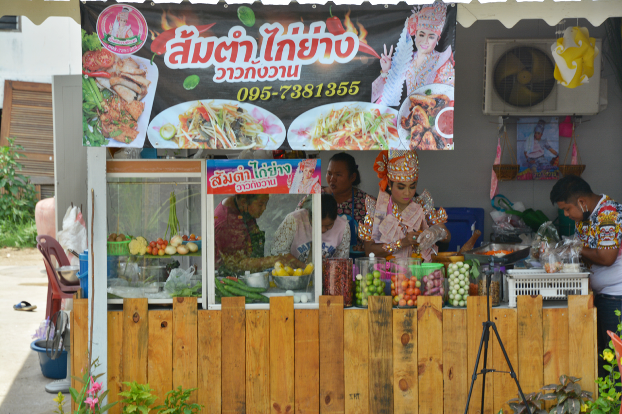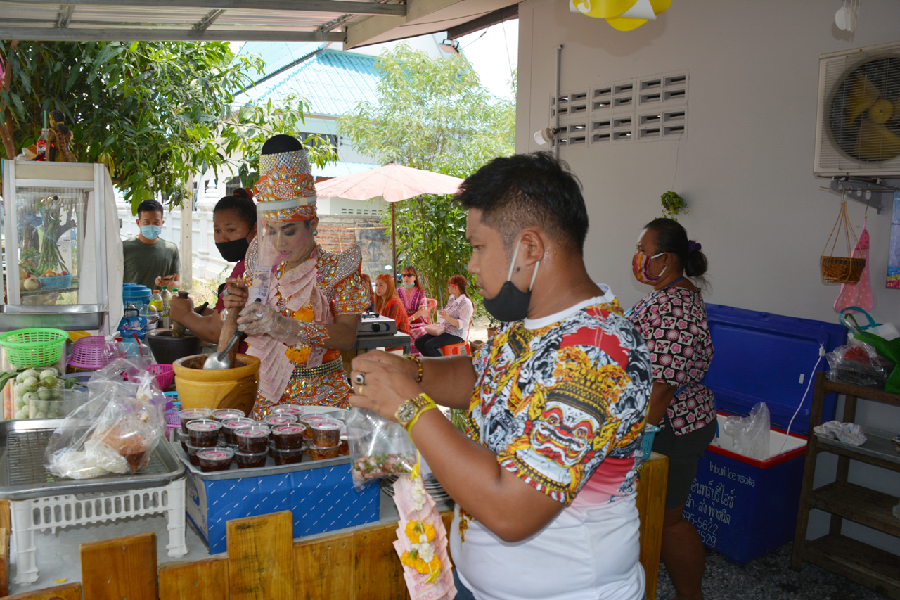 โดยวันนี้เปิดร้านเป็นวันแรก ก็มีแม่ยกและลูกค้าที่เห็นตนใส่ชุดลิเกแวะมาอุดหนุน ทางร้านมี อสม.มาวัดไข้และมีเจลแอลกอฮอล์ สแกนอุณหภูมิลูกค้าก่อนเข้าร้าน ซึ่งทุกคนให้ความร่วมมือเป็นอย่างดี โดยทางร้านมีส้มตำ อาหารตามสั่ง น้ำพริก และอีกหลายอย่างที่ญาติๆ มาตั้งขายกัน โทรสอบถามได้ที่เบอร์โทร.09-5738-1355
