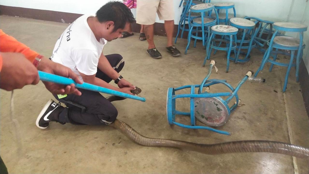 เมื่อมาถึงสุสานมังกรทอง-บ้านท่าน้ำ ม.3 ต.คลองกิ่ว อ.บ้านบึง จ.ชลบุรี จึงได้เข้าตรวจสอบภายในศาลาของสุสานที่เป็นพื้นปูนซีเมนต์ มีโต๊ะหินอ่อนวางอยู่เป็นจำนวนมาก และพบงูขนาดใหญ่แอบไปซุกซ่อนตัวที่ใต้เก้าอี้เหล็กมุมเสา จากการตรวจสอบอย่างละเอียดปรากฏว่าเป็นงูจงอาง หรือ บองหลา เจ้าหน้าที่กู้ภัยต้องใช้ความระมัดระวังอย่างสูงเนื่องจากงูมีท่าทีที่ดุร้าย