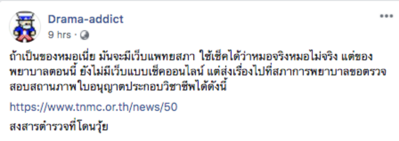 ขณะที่แฟนเพจ Drama-addict โพสต์ข้อความว่า ถ้าเป็นของหมอเนี่ย มันจะมีเว็บแพทยสภาใช้เช็กได้ว่าหมอจริงหมอไม่จริง แต่ของพยาบาลตอนนี้ยังไม่มีเว็บแบบเช็กออนไลน์ แต่ส่งเรื่องไปที่สภาการพยาบาลขอตรวจสอบสถานภาพใบอนุญาตประกอบวิชาชีพได้ดังนี้ (คลิกที่นี่)