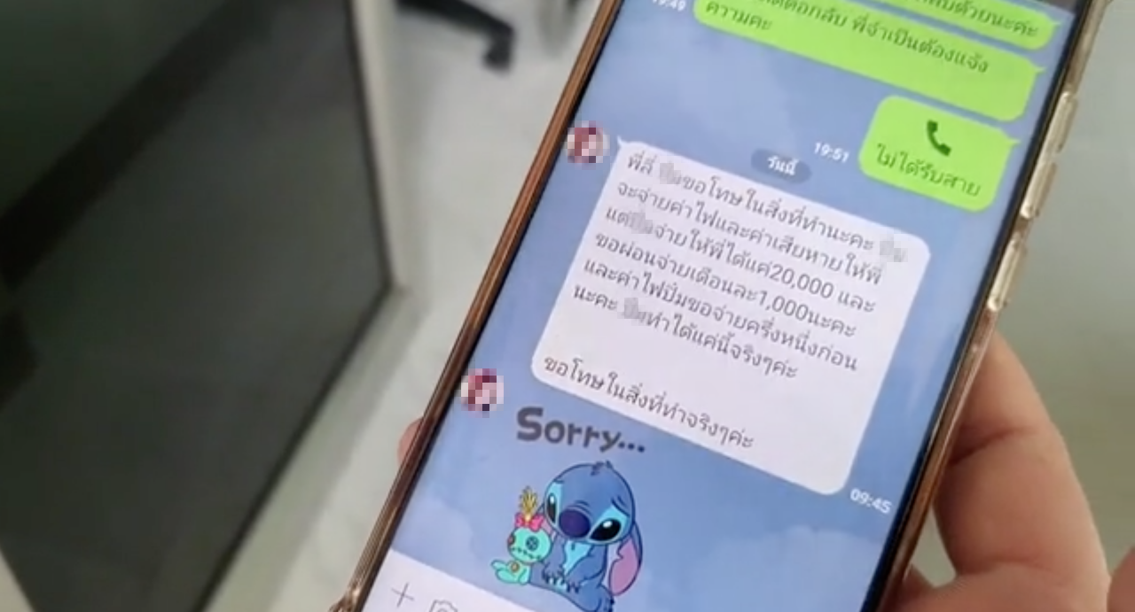 อย่างไรก็ตาม ระหว่างที่ผู้สื่อข่าวลงพื้นที่ พบว่า ผู้เช่าซึ่งเป็นสาวไทย ได้ทักเข้ามาที่แอปฯไลน์ของผู้เสียหาย เพื่อขอโทษกับเหตุการณ์ที่เกิดขึ้นทั้งหมด และยินดีที่จะชดใช้ค่าเสียหายเป็นจำนวนเงิน 20,000 บาท โดยจะผ่อนจ่ายเดือนละ 1,000 บาท ส่วนค่าไฟฟ้าจะขอจ่ายครึ่งเดียวก่อน ซึ่งเจ้าของห้องพยายามนัดให้คู่กรณีเข้ามาพูดคุยเจรจา แต่ถูกบ่ายเบี่ยง อ้างว่าไม่สะดวกที่จะมาพบ.