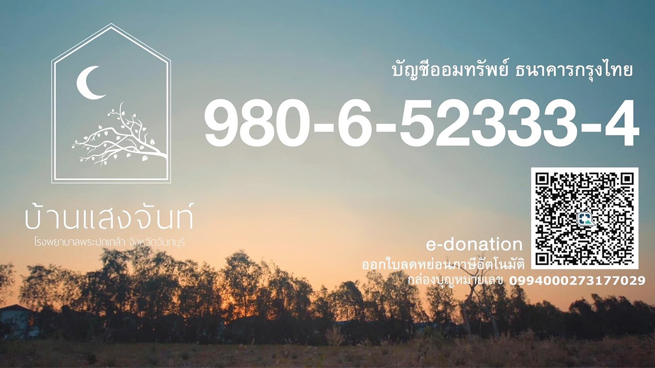 ขอเชิญผู้มีจิตอันเป็นกุศล ร่วมสมทบทุนก่อสร้างบ้านแสงจันท์ บ้านพักพิงสำหรับผู้ป่วยและญาติผู้ยากไร้ เพื่อส่งเสริมทำให้การรักษามีประสิทธิภาพเพิ่มมากขึ้นครับ