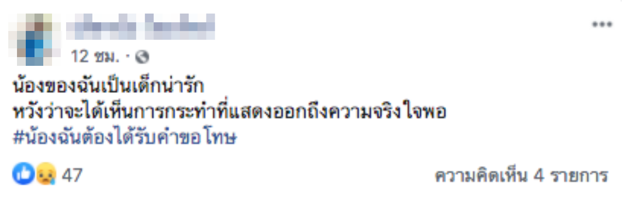 ขอให้น้องไปสบายไม่ต้องกังวลอะไร ชาติหน้าขอให้เราได้มารู้จักและเป็นมิตรที่ดีต่อกันอีก ปล.ขอแสดงความเสียใจต่อครอบครัวน้องด้วย น้องของฉันเป็นเด็กน่ารัก หวังว่าจะได้เห็นการกระทำที่แสดงออกถึงความจริงใจพอ"