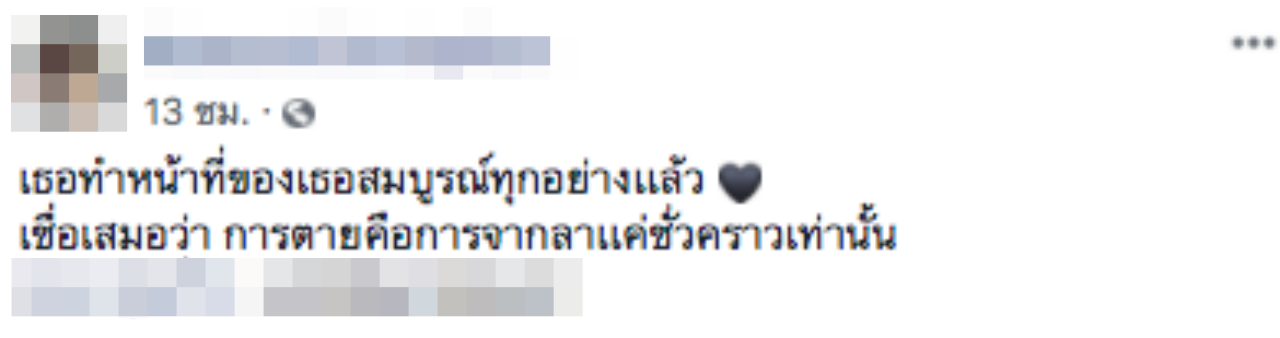 "เธอทำหน้าที่ของเธอสมบูรณ์ทุกอย่างเเล้ว เชื่อเสมอว่า การตายคือการจากลาเเค่ชั่วคราวเท่านั้น"